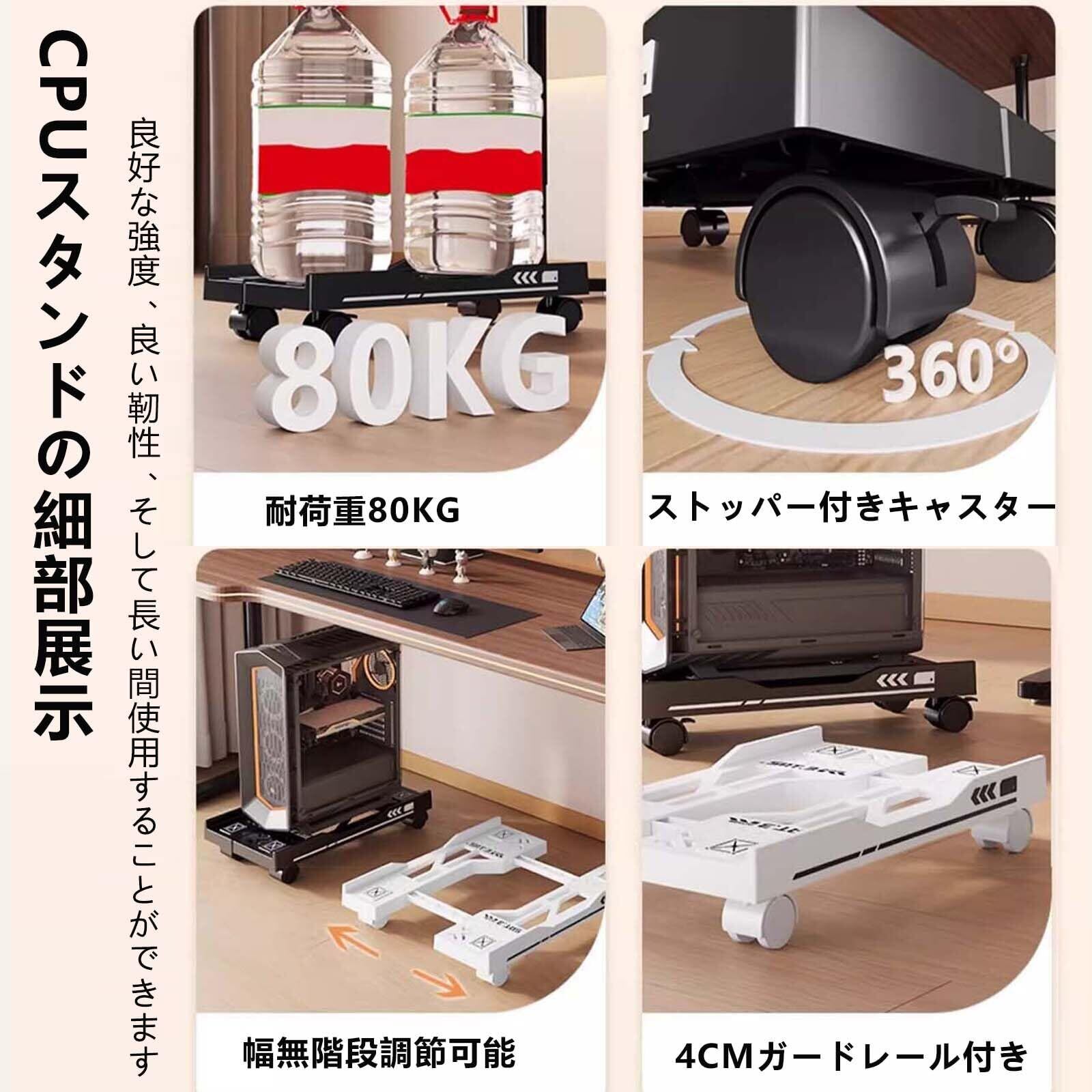移動ラクラク&ストッパー付きキャスター:360度回転可能なキャスターで、重い機器もスムーズに移動。ストッパー機能で任意の位置で固定可能です。凹凸のある床面でも本体をしっかり固定します。掃除なども簡単にできます。また、ストッパーを固定したら、安定性も抜群です。