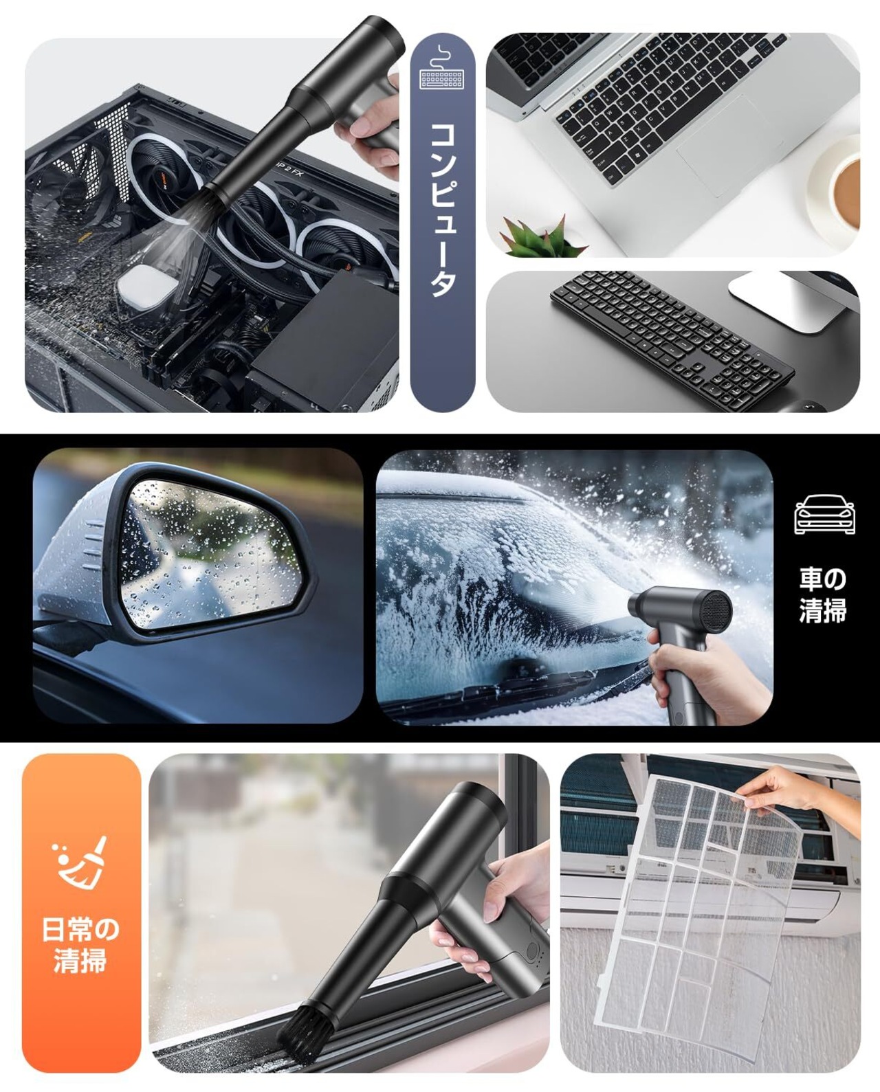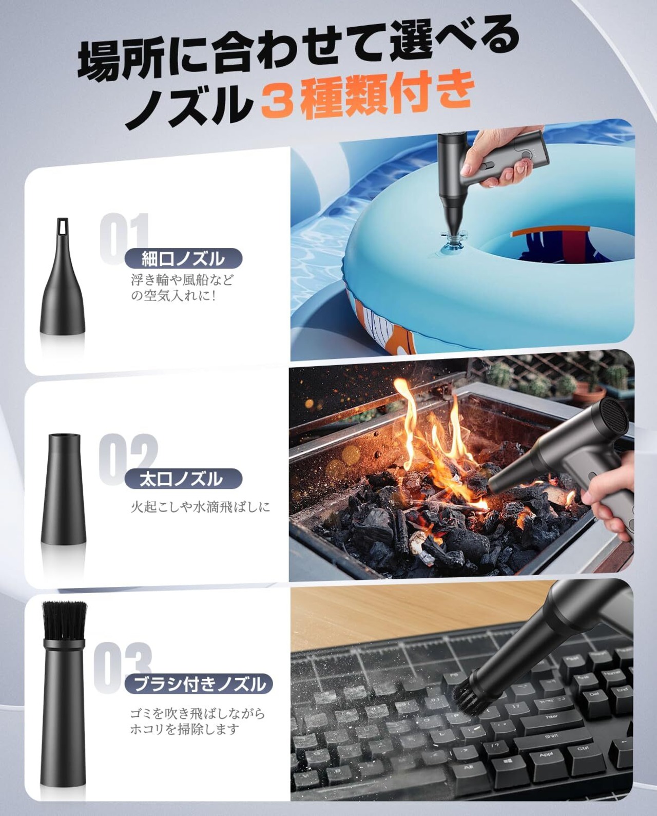 【3種類のノズル&使いやすさ】3種類のノズル:細口ノズル1本、ブラシ付きノズル1本、太口ノズル1本。電動エアダスターには、キーボードの隙間、PC周り、卓上、エアコン、火を起こす道具、車内、窓のサッシ、掃除機のフィルター、浮き輪の空気入れ、洗車後の乾燥など、あらゆる場所で使用可能です。【ご注意】充電中の使用は、感電・火災・故障の重大な危険があります。安全のため、充電が完了してからご使用ください。