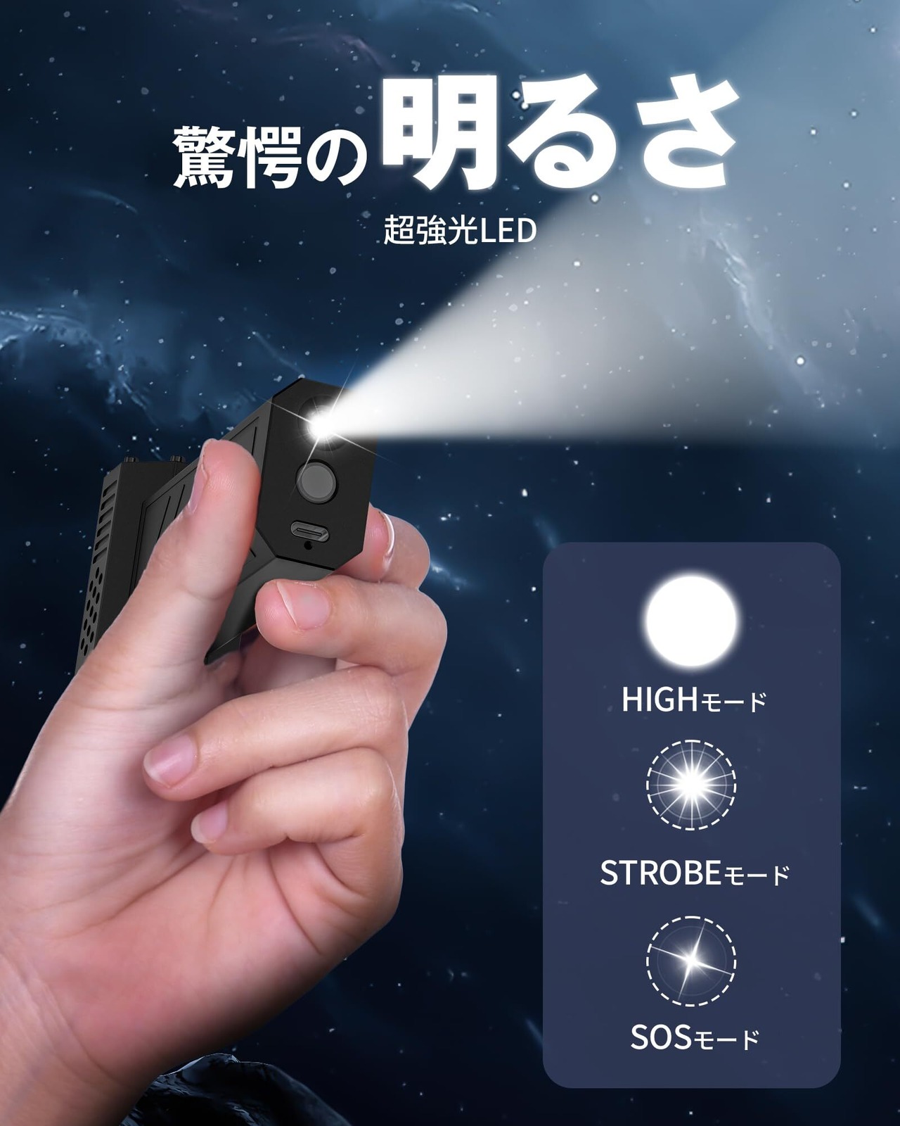 【“超高輝度”LEDライト・驚異の明るさ】高輝度LEDチップと高機能素材を採用し、実用性と耐久性に優れた充電式ブロワーです。さらに、3種類の点灯モードが搭載されています。 ➀ HIGHモード:最大出力で強力に照射。 ② STROBEモード:激しく点滅します。 ③ Slow Flashモード:ゆっくりと点滅します。 スイッチを押すたびに、高輝度 → 高速点滅 → 低速点滅 → OFF の順でモードが切り替わります。 万が一、救助が必要な際に懐中電灯やフラッシュライトを使用して救助を呼ぶ場合、この点滅パターンで明確に救助の意思表示を行うことができます。