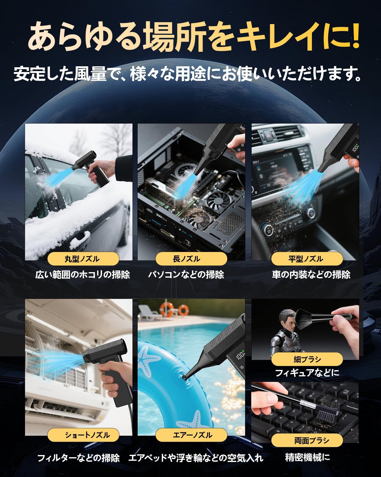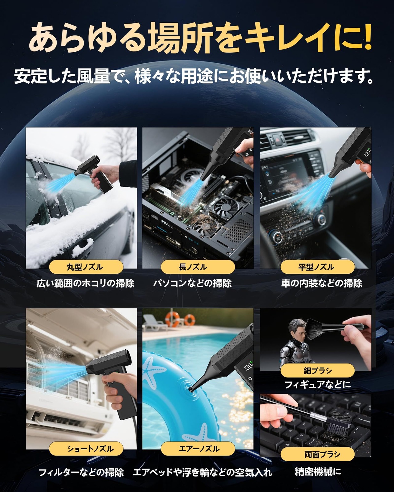 【5種類のノズル付き&高輝度LEDライト2つ搭載】使用シーンに合わせて、ノズルを簡単に切り替えて、あらゆる場所をキレイに! 丸型ノズル:広い範囲のホコリの掃除。長ノズル:パソコンなどの掃除。平型ノズル:車の内装などの掃除。ショートノズル:フィルターなどの掃除。エアーノズル:エアベッドや浮き輪などの空気入れ。細ブラシ:フィギュアなどに。両面ブラシ:精密機械に。安定した風量で、様々な用途にお使いいただけます。最新型のLED強光チップを採用し、ライトの使用寿命は10000hに達します。明るく、光が均一。両端の異なる機能にそれぞれライトを搭載、それぞれ操作でき、夜間や隅などの暗い場所でもはっきり見えてお掃除できます。