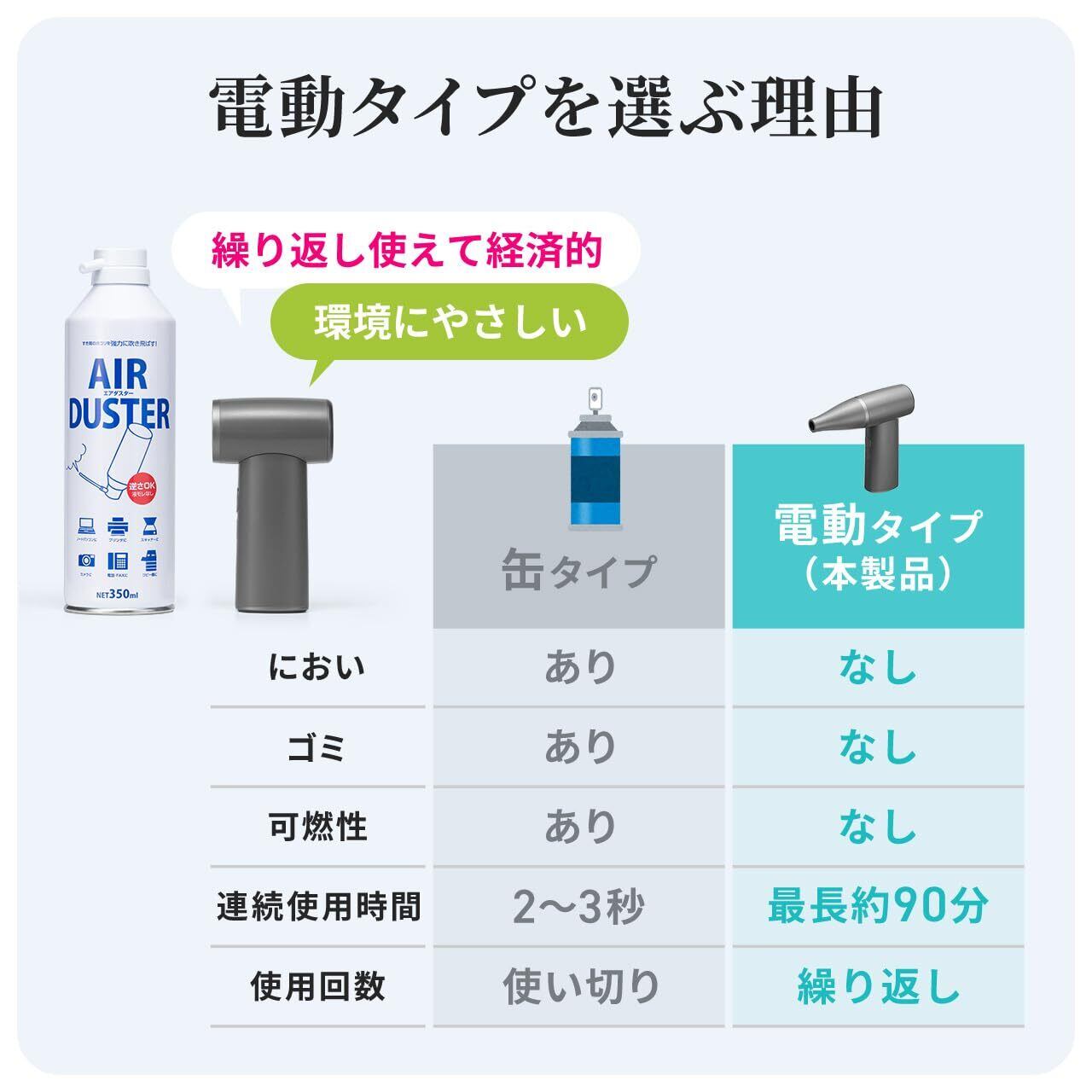充電式で繰り返し使えるため、経済的で安全な商品です。通常のエアダスターに比べ、繰り返し購入する必要がなく、 ガス の匂いや空き缶の処理、火気による危険がありません。