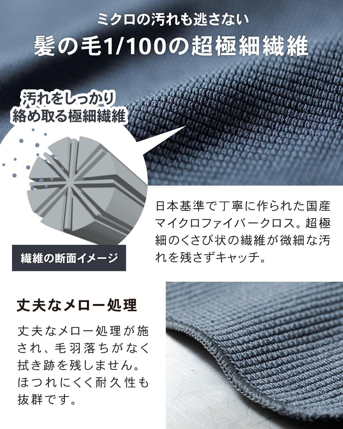 【大手メーカーが採用するプロ仕様、段違いの指紋&汚れ除去力】超極細繊維が指紋や油性・水性のあらゆる汚れを残さず拭き取る、日本製マイクロファイバークリーニングクロスです。髪の毛の1/100の超極細繊維が段違いの汚れ除去力を発揮します。指紋や汚れはもちろん、微細なミクロの汚れまでもしっかり絡め取ります。拭き残しがありません。