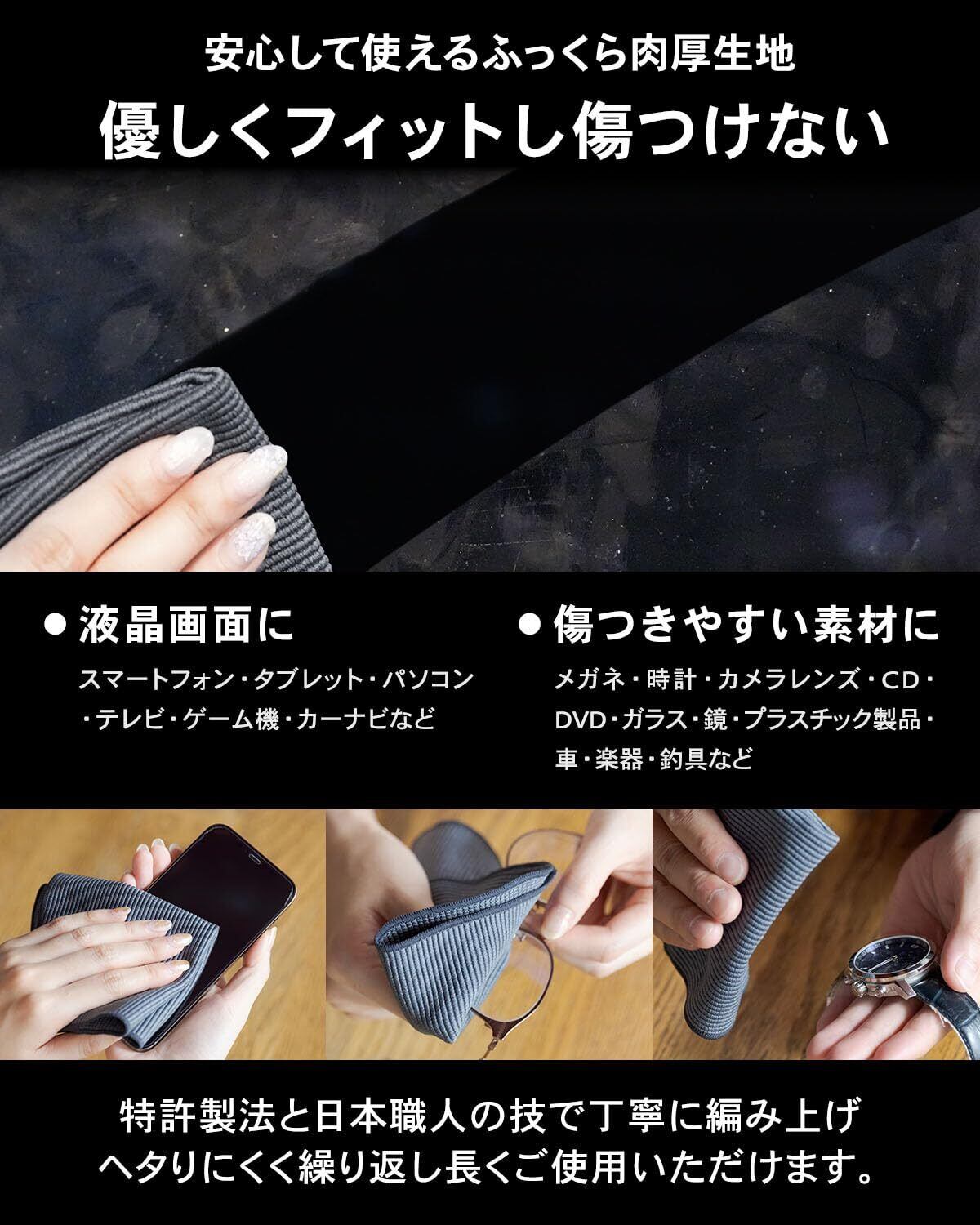 【肉厚やわらか生地で傷がつかない&毛羽が出ない】製法の程よい弾力のある肉厚生地は、対象物に優しくフィットし無駄な力がかかりません。傷がつきにくく、メガネやスマホなどの液晶画面や繊細なカメラレンズやガラス製品を優しくお手入れできます。高品質マイクロファイバーを日本の職人の技で編み上げることにより、毛羽落ちが限りなく少なく繊維が残りません。ヘタりにくく耐久性も抜群です。