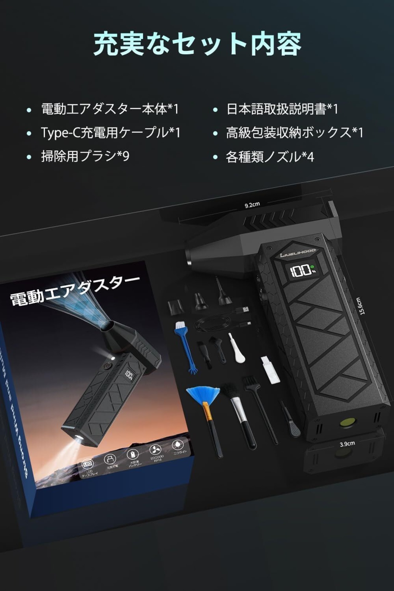 【互換と!24時間無休心強いサポート】①12ヶ月製品:ご注文日から12ヶ月の間。■②お問い合わせ方法:「注文履歴」→「注文に関する問題」→「プロフィールを表示」→「質問する」■③【お届け内容】電動エアダスター本体*1、4種類ノズル、Type-C充電用ケーブル*1、掃除用ブラシ*9、日本語取扱説明書*1。本体サイズ:15.6cm x 9.2cm x 3.9cm 、重さ:315g。
