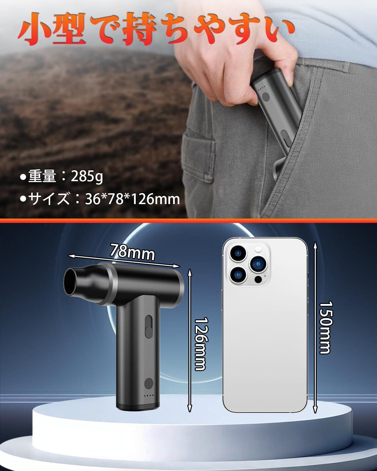 【コンパクトで持ちやすい】充電式ブロワーのサイズは126×78×36mm、重量はわずか285gで、片手でも持ちやすいです。このブロワー 強力は、滑り止め設計で、長時間の使用でも安定した操作感と高いコントロール性能を提供します。軽量でコンパクトなデザインで、家やオフィス、外出先でもスムーズに持ち運べ、いつでもどこでも手軽に清掃ができます!