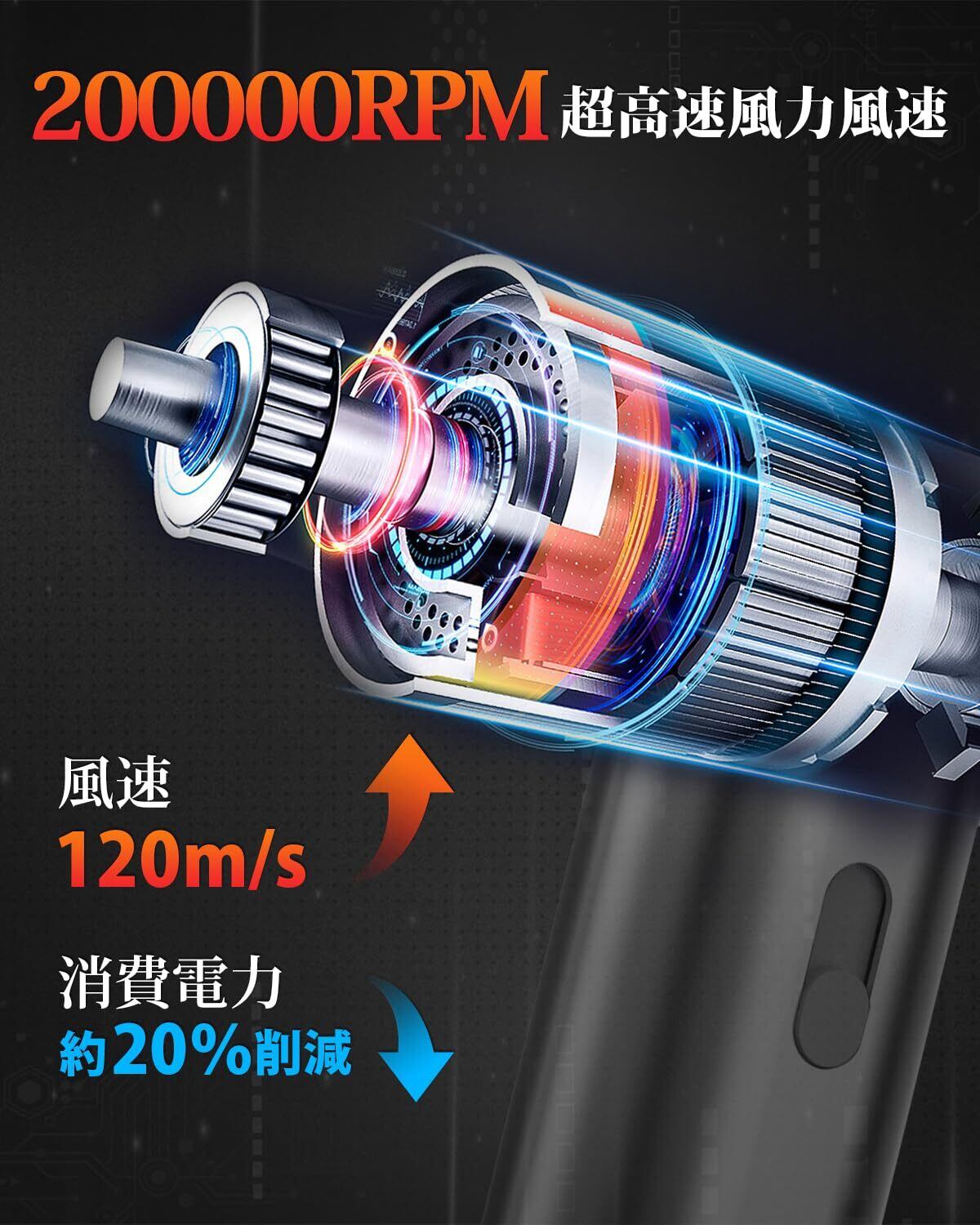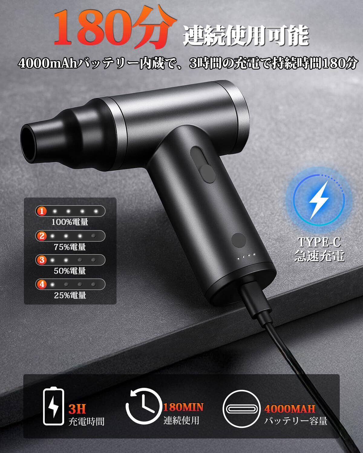 北澤商事 電動エアダスター 洗車 ブロワー 200000RPM高速回転 風速120m/s 最強ブロワー 4000mAhバッテリー エアダスター 無段階風量調整 過熱保護 エアーブロアー 小型 軽量設計 USB Type-C充電式 pc 3種類ノズル付き PC掃除 キーボード 家具 車内 洗車用 日本語取扱説明書付き