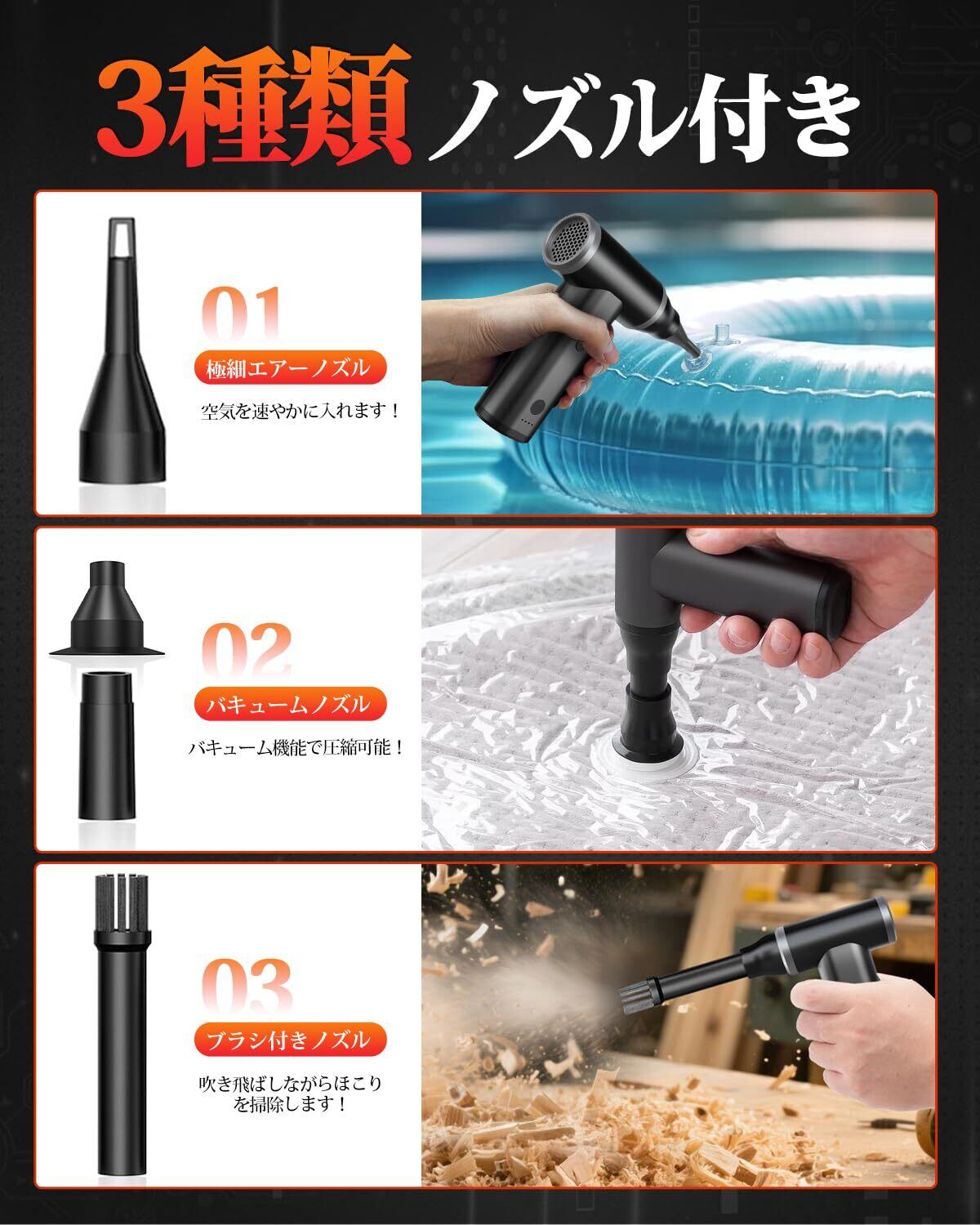 【3種類ノズル付き&多用途使用】3種類のノズル:極細エアーノズル1本、バキュームノズル1本、ブラシ付きノズル1本。充電式エアダスターはキーボード掃除、カメラ掃除、車用掃除とブラインドのクリーニングなどに適用です。それ以外、ブロワーはエアマットレスなどの製品の膨張にも使用でき、火起こし、床掃除、ペットの毛の除去にも適しています。庭の掃除では、葉やクモの巣が簡単に除去され、時間と手間を節約します。また、水と雪の吹き飛ばしに最適です!