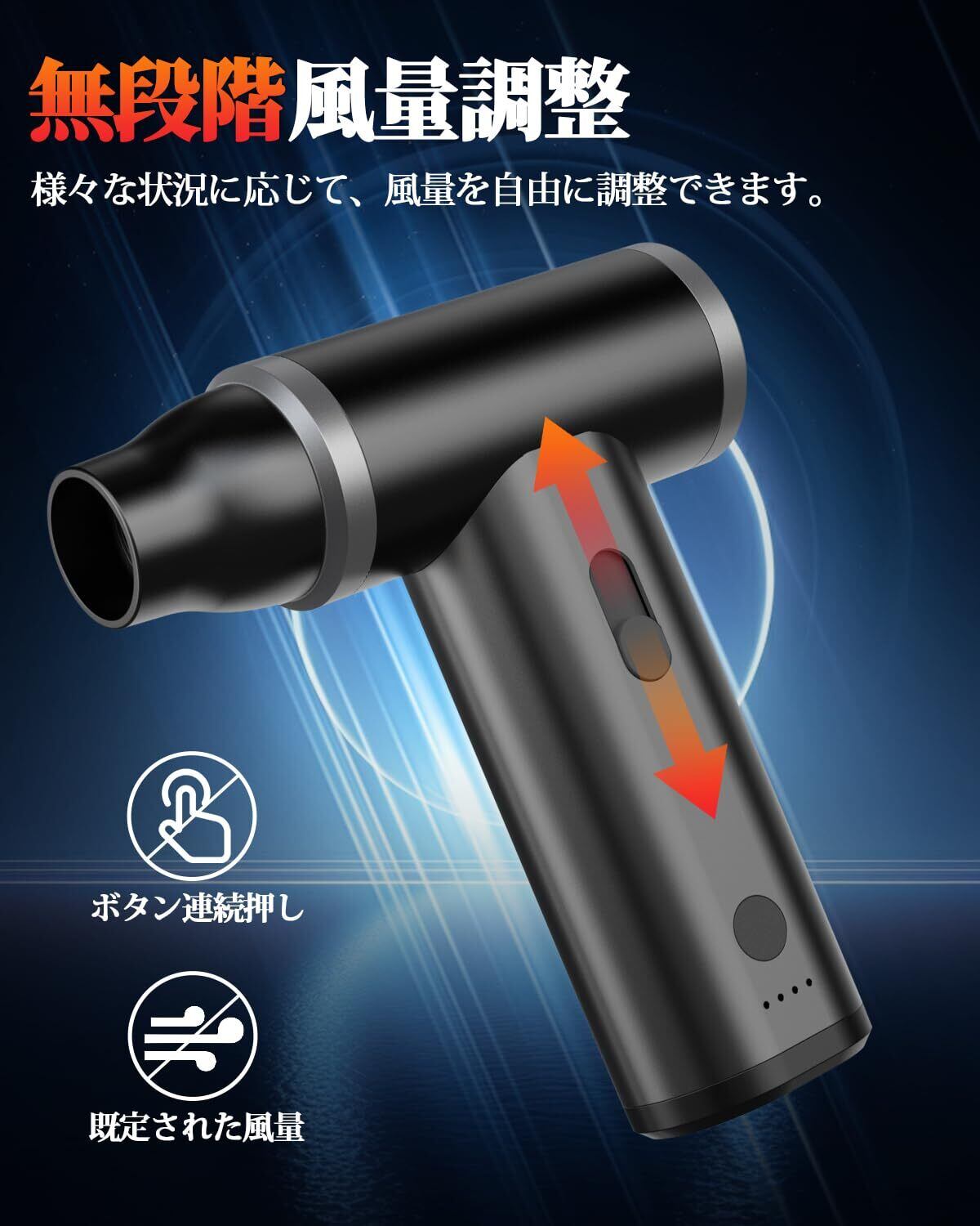 【無段階風量調整&AI保護】風量調整はボタンを上下に移動するデザインにしました。スリープ状態にするまで何回もボタンを押すなどは不要で、設定された階段の風量にも限られません。合う風量で作業するほうが効率一倍アップします!また、本エアダスターは4重の安全保護「過電流保護・過熱保護・過充電保護・過電圧保護」を搭載しており、環境保護だけでなく安全性も確保していますので、安心してご使用ください。