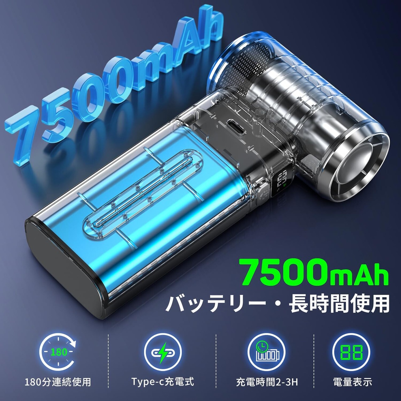 【モバイルバッテリー機能・ディスプレイ表示】 2025年専門研究所に共同開発するエアダスターは他製品がない、独特なモバイルバッテリー機能を搭載します。エアダスターの7500mAhバッテリーは専用的なモバイルバッテリーに負けず充電速度で携帯などの電子製品をフル充電できます。しかもType-C端子でコンセント・パソコン・車載充電など様々な場所でエアダスターを急速充電します。また、エアダスターは液晶ディスプレイを装着します。使用中の風速モードと残っている電量を表示します。一目でわかる便利さは他製品に及ぶことができない。(注意モバイルバッテリーのポートはType-C口、出力電圧は5V2A)
