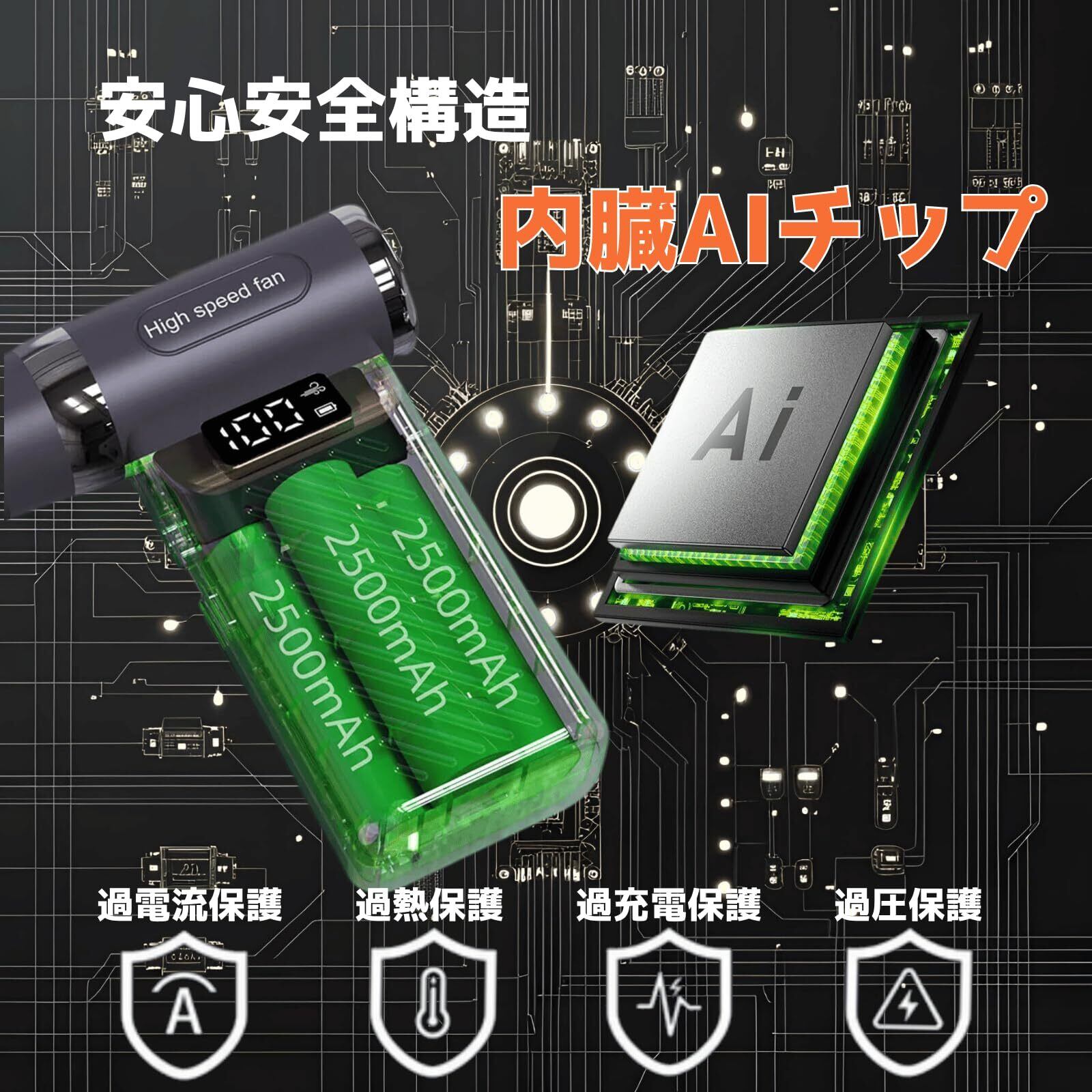 【7500mAh大容量 & 安全対策済み】3倍のバッテリー容量で長時間駆動(最大約120分)。従来の2000mAhモデルを大きく上回る持続力。過充電防止、過熱保護などの安全機能を備え、大容量でも安心してお使いいただけます。