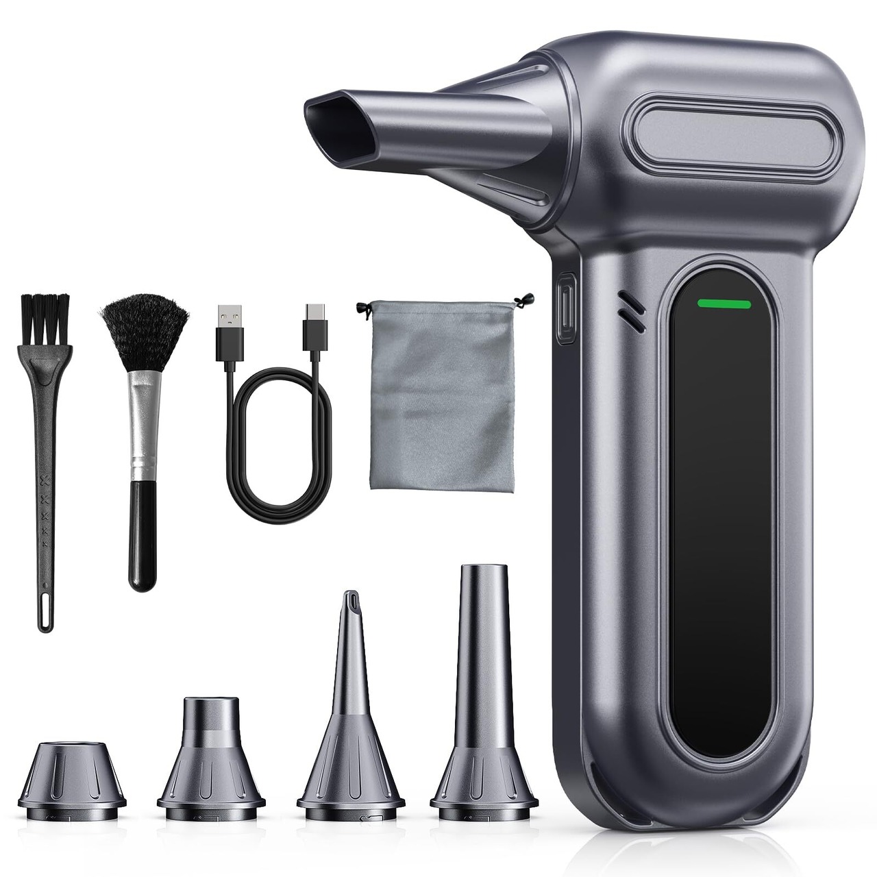 【5種ノズル&2種ブラシで多用途対応!これ1台で隅々まで清掃】orantronx 充電式 エアダスターは、形状と用途が異なる5種類のノズルと2種類のクリーニングブラシを標準装備。細かな隙間に届く丸型ノズル、広範囲を吹き飛ばす平口ノズル、空気入れ用の注入ノズルなどを使い分けることで、キーボードやPC内部、車内、エアコン、キャンプ用品、洗車後の水切りまで1台で幅広く対応できます。さらに、付属のブラシで静電気に付着したホコリや細部の汚れも除去可能。ノズルとブラシの組み合わせにより、ただ吹くだけでは届かない場所もしっかりお掃除できます。