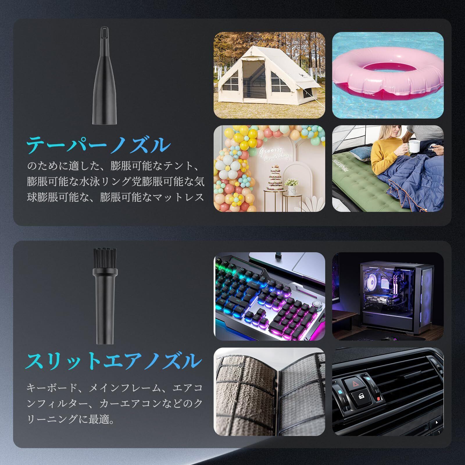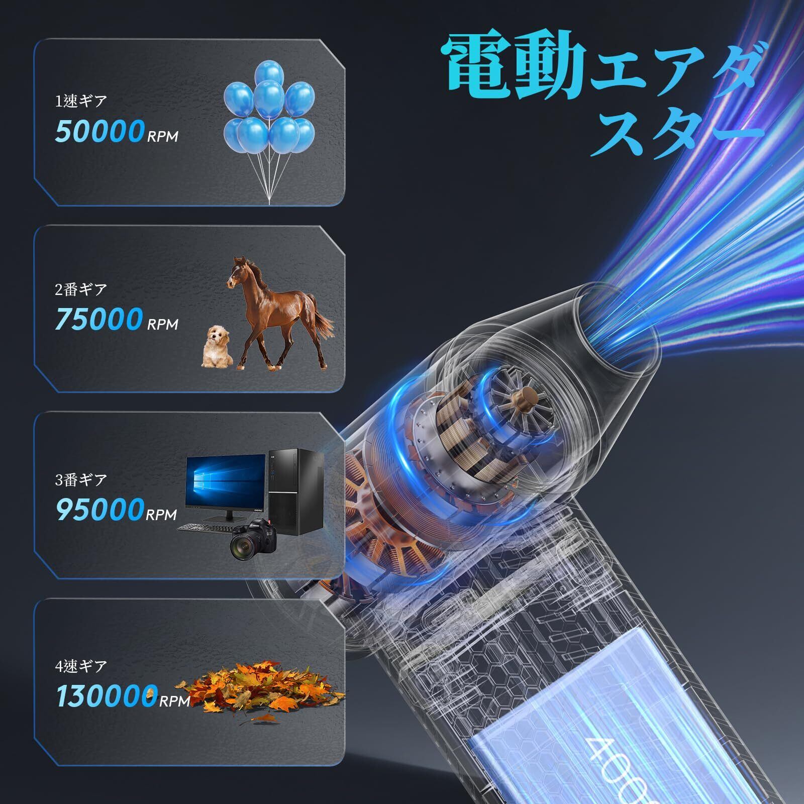 【4段階風速調節&簡単操作】このエアダスターは4段階の風速調節機能があり、使用シーンに合わせてお好みの風力に調整できます。ボタン一つで4段階の風速を調節でき、風量は徐々に大きくなったり小さくなったりします。風速切り替え方法:➊弱風--風力ボタンを一回クリックすると弱風モードに切り替わります。➋中風--風力ボタンを再度一回クリックすると中風モードに切り替わります。➌強風--風力ボタンをもう一度一回クリックすると強風モードに切り替わります。➍爆風モード--風力ボタンを長押しすると爆風モードが入り、指を離すと爆風モードが切れます。いつでも長押しで爆風モードに入ることができます。