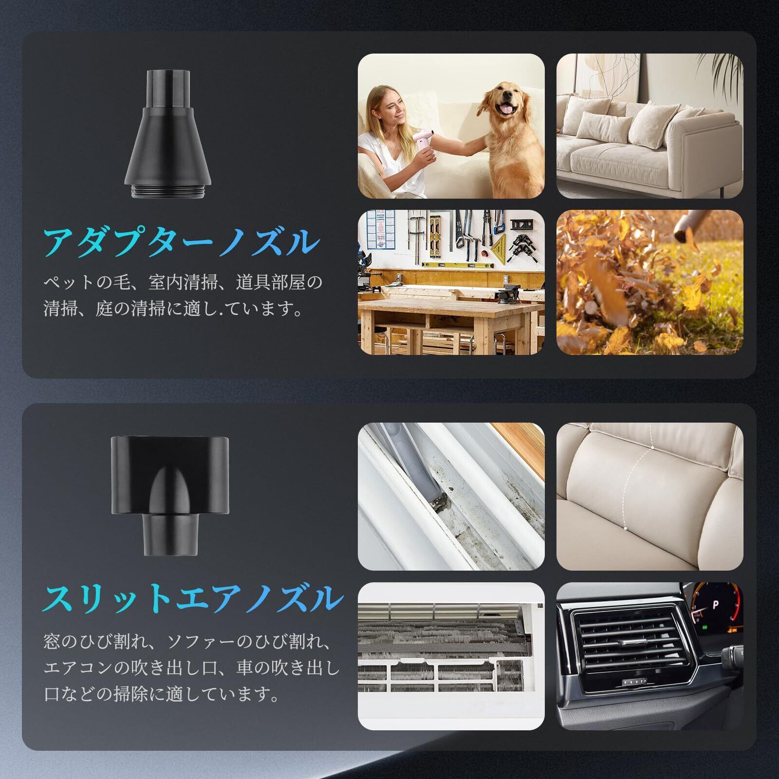 【コードレスで携帯用に便利】エアダスターのサイズは134×60×30mm、重量はわずか260gで、手のひらサイズのため片手でも持ちやすいです。また、収納に便利な収納ケースが付属しています。軽量でポータブルな充電式電動エアダスター、軽くて仕事場や車内に持ち運びやすい小型エアダスター。車内のホコリ取りや洗車後の水滴を吹き飛ばす、扇風機、エアコンなど家電のホコリ掃除、車の除雪に、キーボード、マザーボード、CPUクーラー、PCケースなど各パーツのホコリ取り、カメラレンズや光学センサーなど精密機器の掃除、窓、ソファなど部屋のお掃除など幅広い分野活躍します。