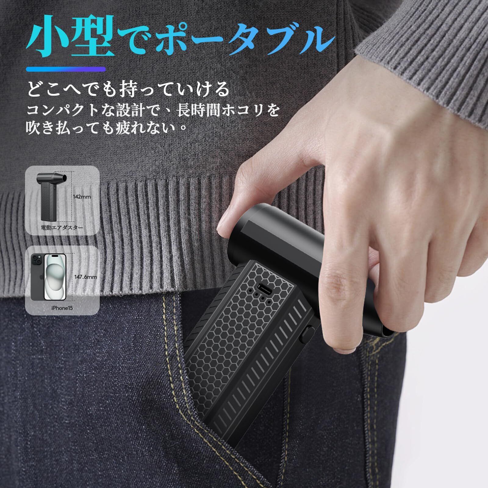 【使用頻度の高い方におすすめ】電動エアダスターはエアダスター スプレーを大量に使用する場合の代替品です。繰り返し使用できるので経済的、スプレー缶のように頻繁に補充必要もないし危険な缶ゴミも出ない。缶ダスターと違って残量を気にせず気兼ねなく使える電動式エアダスター。お金を節約できお財布にやさしいです!ガスの匂いがなが苦手な方にもぜひお試しください。この強力なエアダスターは、4000mAhの容量を持つのリチウム電池を内蔵しており、外部電源なしでワイヤレスで動作が可能です。また、TYPE-C充電ポートは20Wの急速充電に対応しており、高速で効率的な充電が可能です。