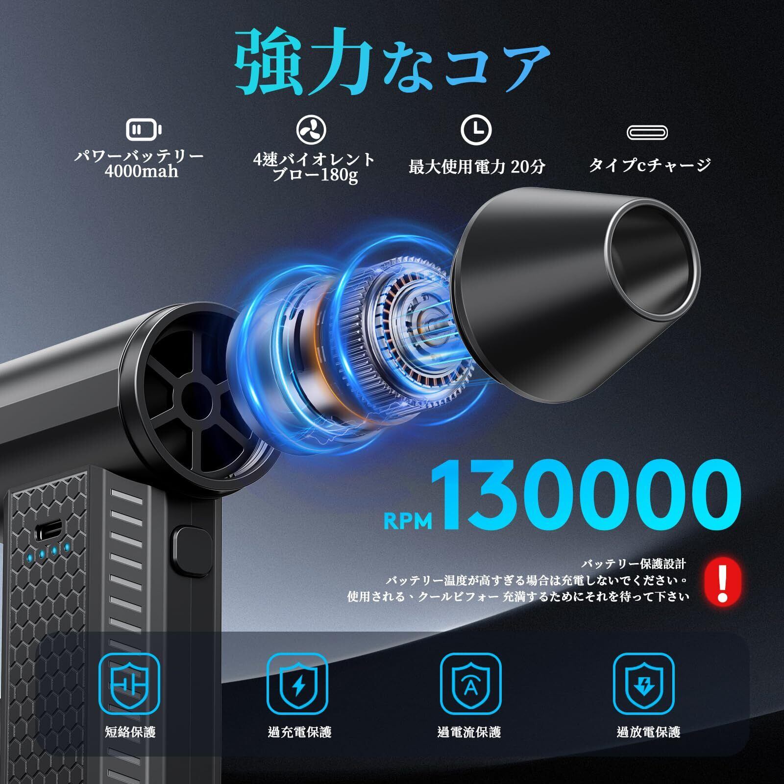 FOURQ PSE認証圧縮空気ダスターキット-ブロワー-PCダスター電気-130000RPM-4000mAh大容量バッテリー 超強力 ブラシレスモーター Type-C充電式 小型軽量 過熱保護 充電式エアダスター 5種類ノズル付き PC掃除/キーボード/エアコン/洗車用 収納ボックス付き ブラシ付き 日本語取扱説明書付き(ブラック)