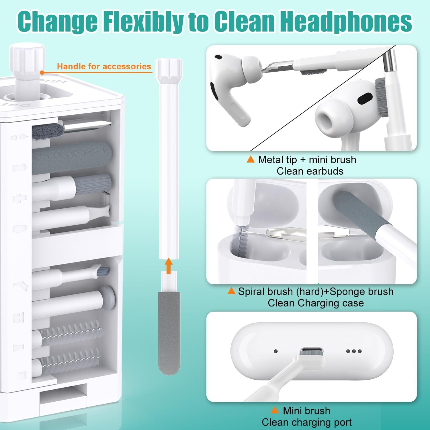イヤホン掃除ツール:イヤホンクリーニングペンは金属チップで頑固な汚れを掃除でき、ミニブラシはイヤホンメッシュを掃除し、丸いスポンジブラシと柔らかいブラシは充電ケースの奥に隠れたホコリや汚れを掃除できます。
