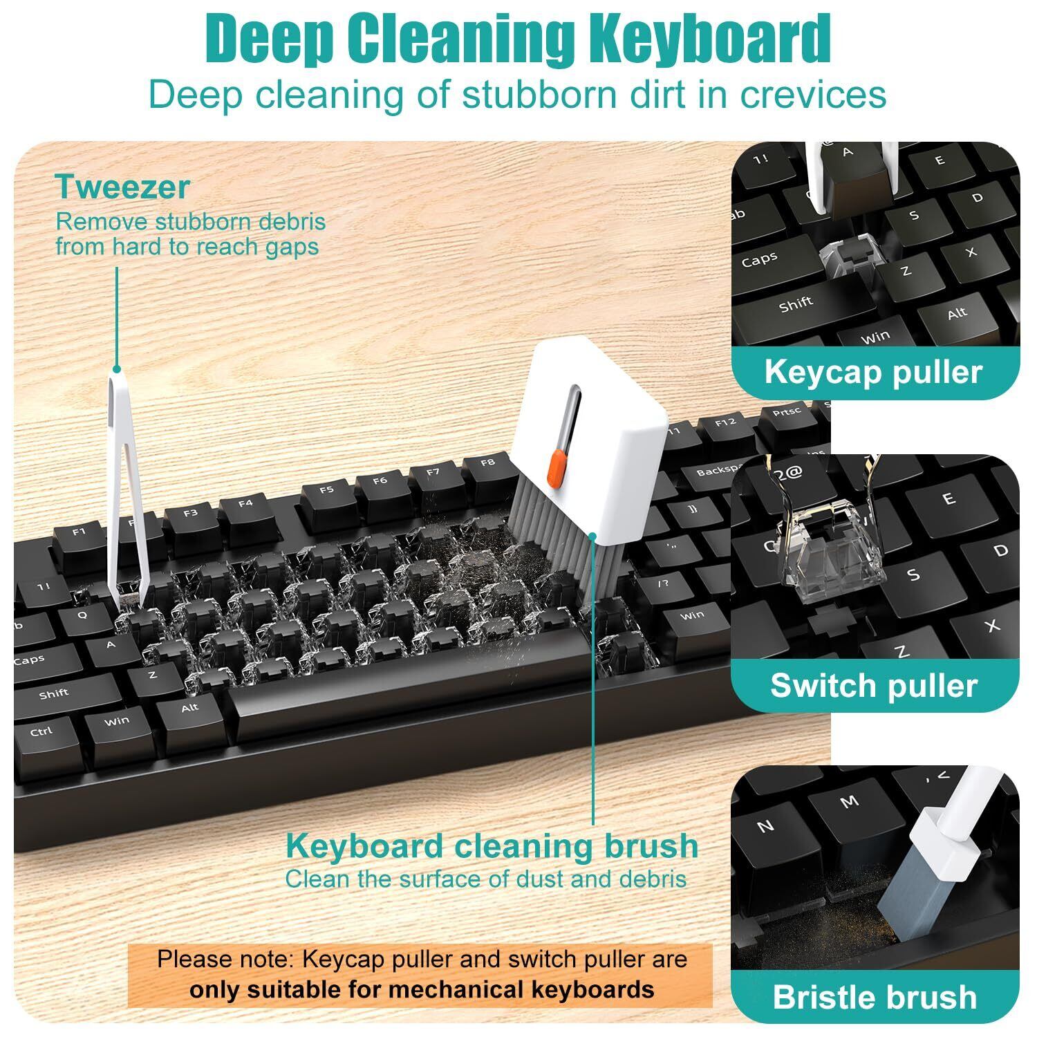 キーボードとPCのクリーニング: 高密度キーボードクリーニングブラシは、キーボードの表面のホコリを簡単に掃除することができます。キーキャッププーラーとスイッチプーラーにより、メカニカルキーボードパーツを簡単に取り外すことができます。毛の硬いブラシとピンセットを使えば、より深く掃除できます。5mlのスプレーボトル(液体なし)が付き、洗浄液を入れ、ファイバークロスにスプレーし、スクリーン(電話、タブレット、PCモニター)を拭くと、油汚れや指紋を簡単に取り除くことができます。