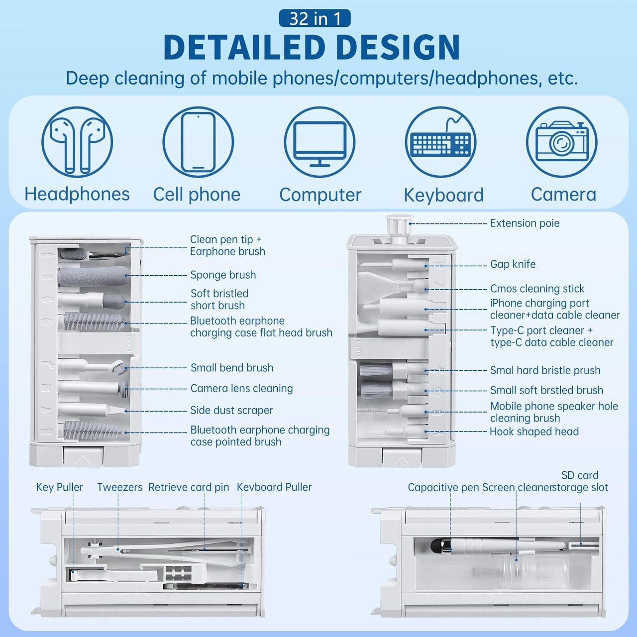 32機能部品:16.延長レバー 17.ピンセット 18.タッチペン 19.スクリーンクリーナ 20.ブルートゥースイヤホン充電槽ブラシ 21.ポートピッカー 22.カメラレンズ消しゴム 23.エルボブラシ 24.SiMカード取り外しツール 25.ブルートゥースイヤホン充電箱ブラシ 26.軟毛短ブラシ 27.ブルートゥースイヤホン充電間清掃棒 28.金属ペン先 29.ブルートゥースイヤホンブラシ 30.キーキャップ引き抜き器 31.スクリーン清掃布 32.キーボードブラシ