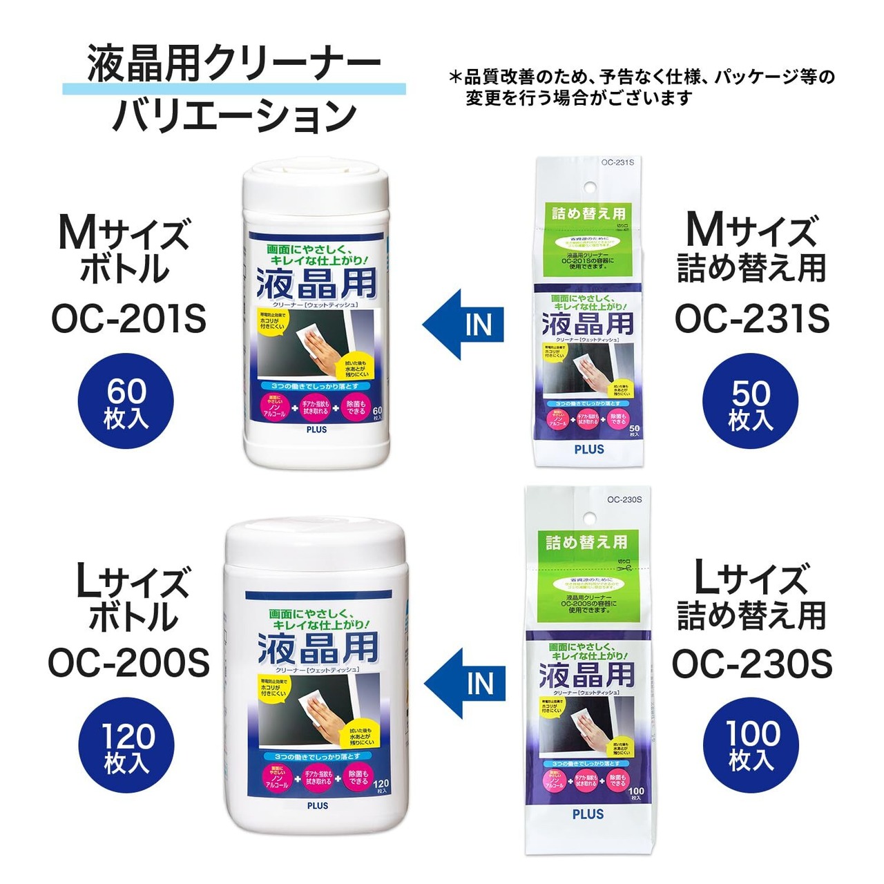 プラス 液晶用クリーナー ノンアルコール Mサイズボトル 本体 60枚入 OC-201S 68-825