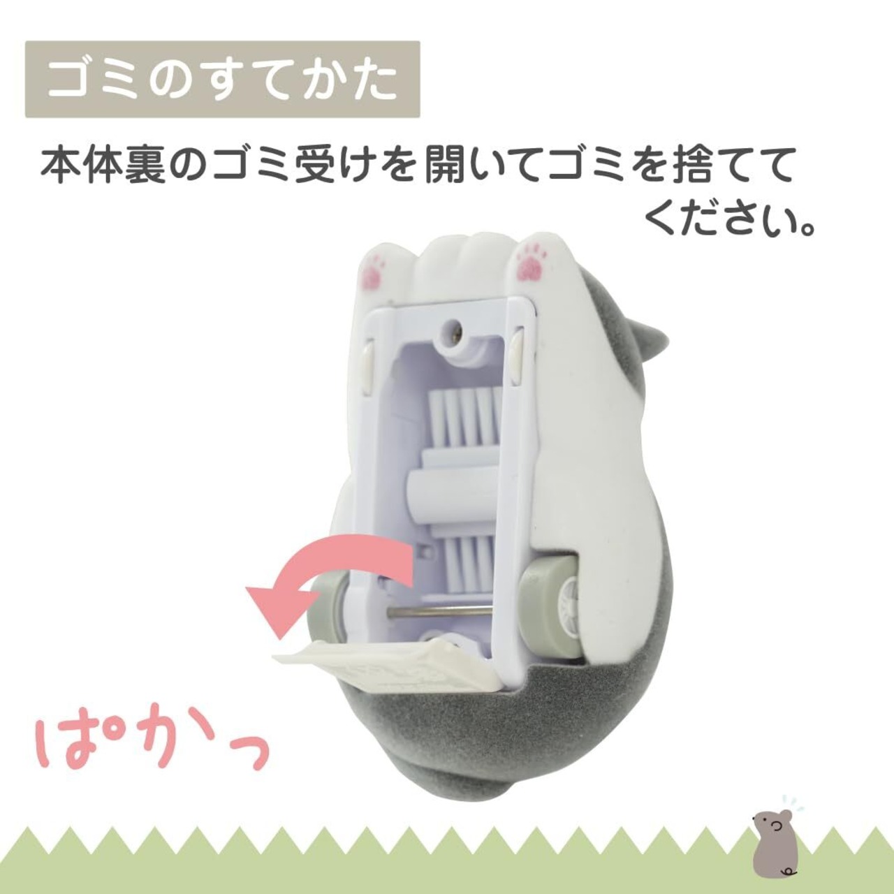 使い方:ゴミの上で本体を押して転がしてください。 ゴミの捨て方:底面にあるゴミ受けを開いて、ゴミを捨ててください。