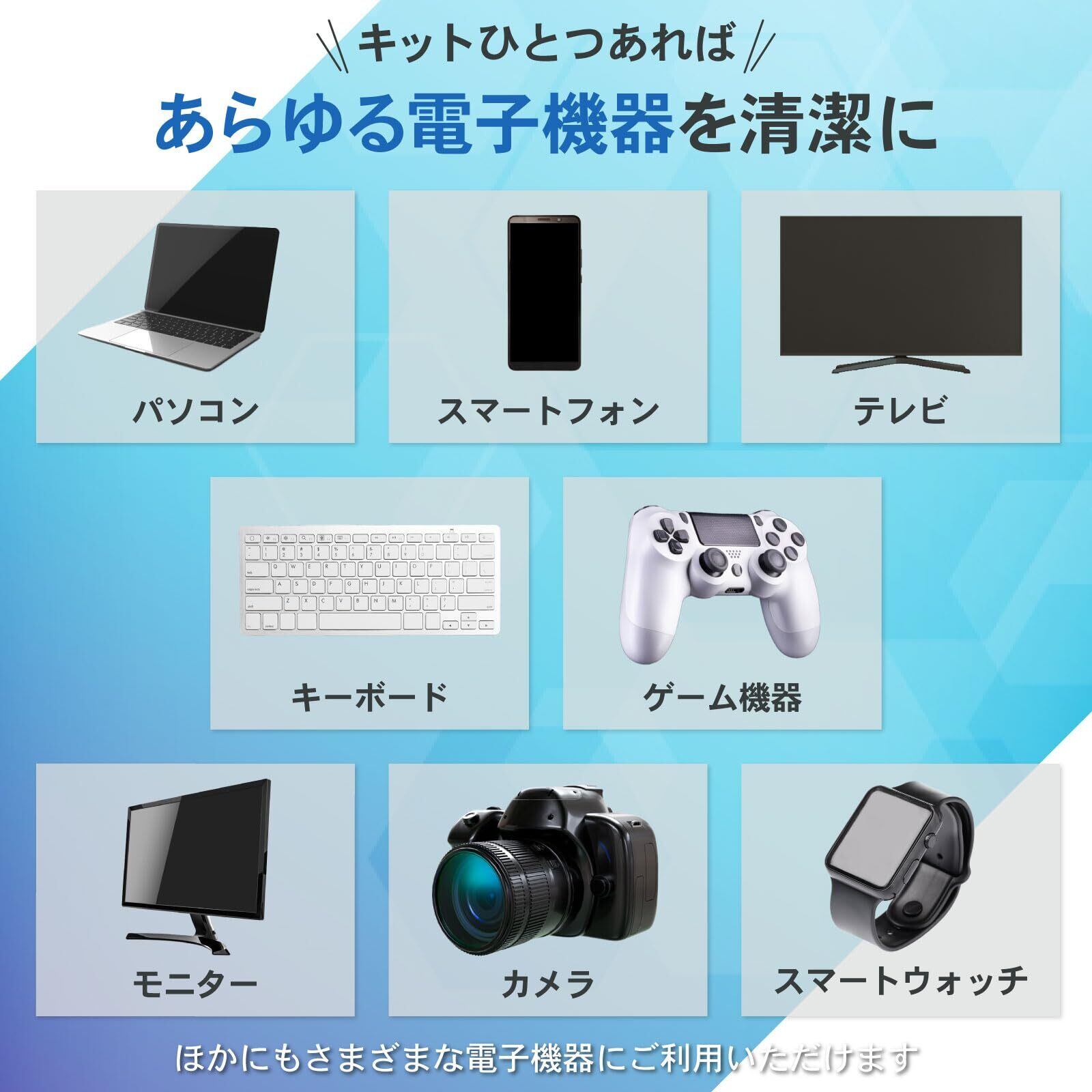 ③収納式 静電気除去クリーニングブラシ - コンピューターのポートやキーボードに適しており、ブラシは届きにくい場所を洗浄し、プラスチック ケース内に格納できるので保管に便利です。④マイクロファイバークロス - この柔らかい傷のつきにくいクロスは、携帯電話やキーボードに最適です。小型のハイテク機器。指紋、ほこり、汚れを拭き取り、洗濯機で洗って繰り返し使用できます。