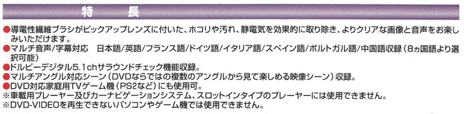 DVDピックアップレンズに付いたゴミやホコリを取り除く乾式クリーナーです。ドルビーデジタル5.1chサラウンドチェック機能収録。