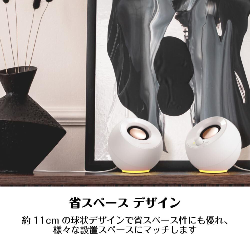 【ケーブル2本接続タイプ:USBから電源 & アナログケーブルで音声を入力】人気のUSB電源スピーカー「Creative Pebble」と同様に、パーソナル リスニングに適したサウンド ステージを実現するアナログ接続タイプのアクティブ スピーカー。スピーカー ボディ下部にはRGB ライティングを搭載しており、7つの発光パターンでデスクトップをライトアップすることが可能、ムードや好みに合わせてライティング パターンを選択可能