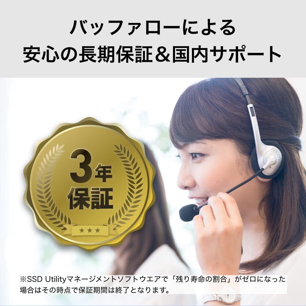 【国産メモリ搭載&長期3年】国内メーカーKIOXIA独自技術を採用した国産BiCS FLASHメモリを搭載し、安心の長期3年に対応。※ただし、SSD Utilityマネージメントソフトウエアで「残り寿命の割合」がゼロになった場合はその時点で期間は終了となります。※正規代理店(バッファローダイレクト)以外から購入した製品は、製品の流通保管の状態によっては、の対象とならない場合があります。※外付けケースを利用しての動作は行っておりません。