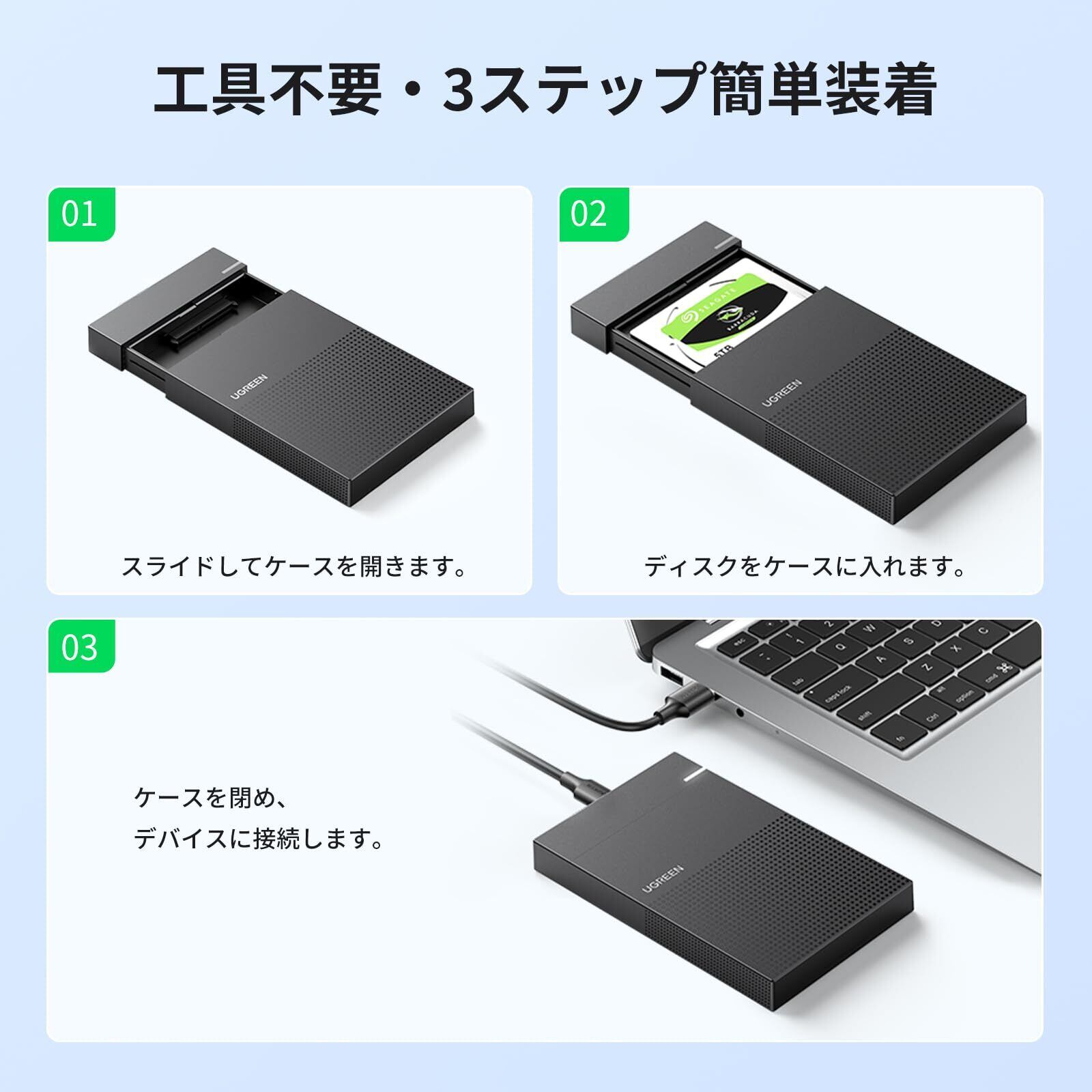 UGREEN 2.5インチ HDD ケース HDD/SSD ケース 【USB 3.1 Gen 2規格】 SATA 3.0 Type-C接続 UASP対応 6Gbps高速転送速度 10TB大容量 9.5mm/7mm HDD/SSD対応 2.5インチ ハードディスクケース 工具不要 Mac OS/Windows/Linux等に対応 【USB C-USB A ケーブル付き】