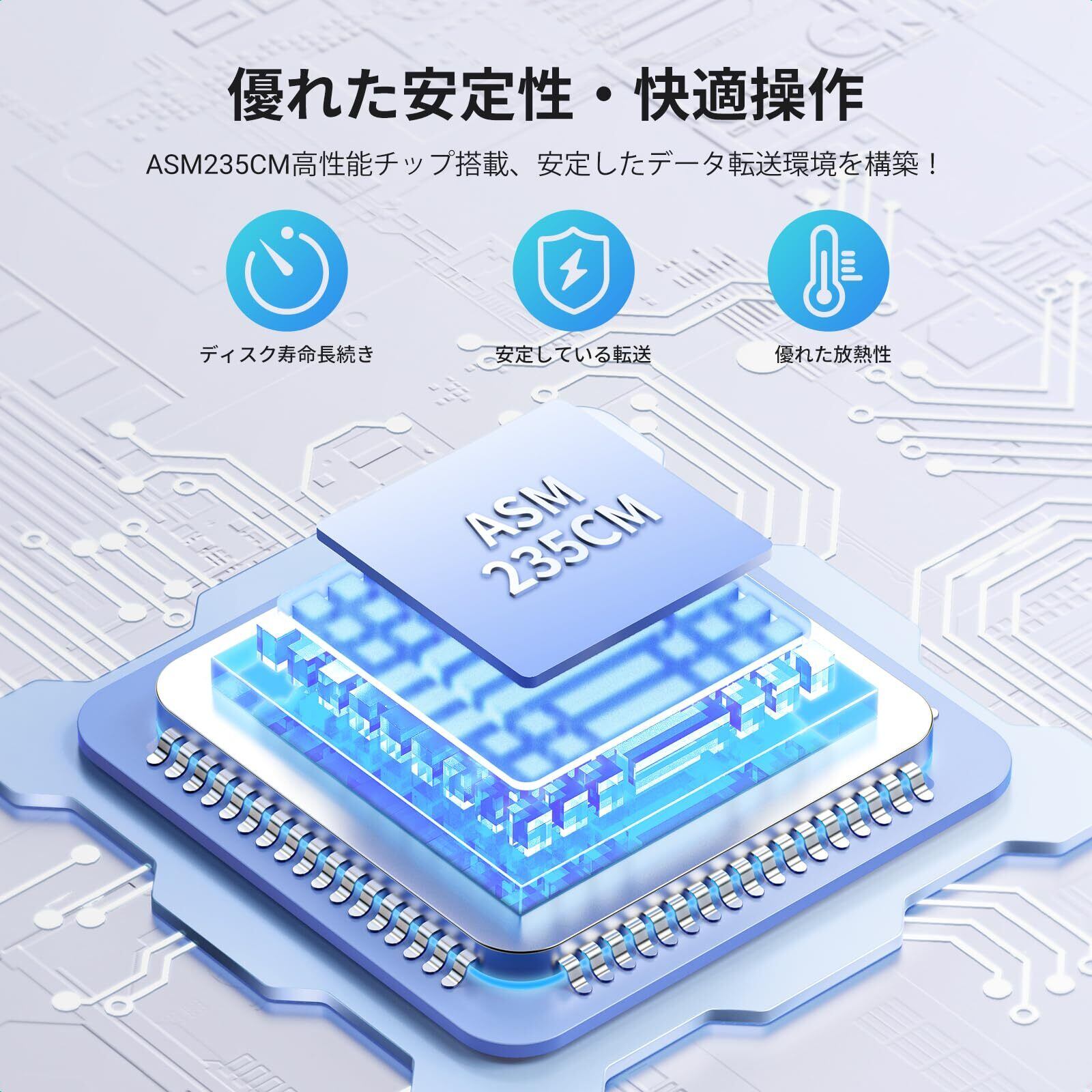 【安心・安全な保護】高性能ASM235CMチップを搭載し、過電流、過電圧、過熱、短絡など多重保護が搭載して安定したデータ転送が実現。高性能ABS素材の特性で、放熱性にも優れ、ドライブの寿命を長続きさせる効果が期待できます。