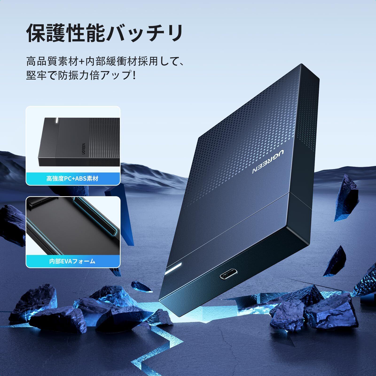 【衝撃や振動からしっかり保護】衝撃・擦り傷に強いABS素材を採用、そして防振クッションが内蔵されており、万が一HDD 外付けケースが落としてしまった時に、ドライブが故障してしまうリスクを大幅に軽減して大事なHDDやSSDをしっかり保護。