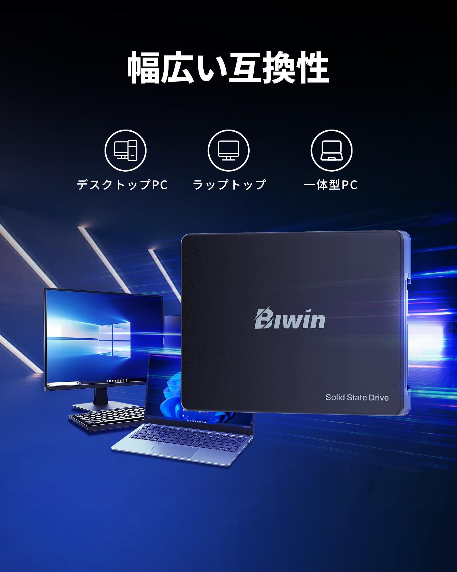 【SATA 3.0対応・最大550MB/s】Biwin M100 2.5インチSSDはSATA 3.0対応で最大550MB/sの高速転送を実現。HDD比3~6倍の性能でOS/アプリ起動が快適に。SATAⅡ互換で幅広い環境に対応。