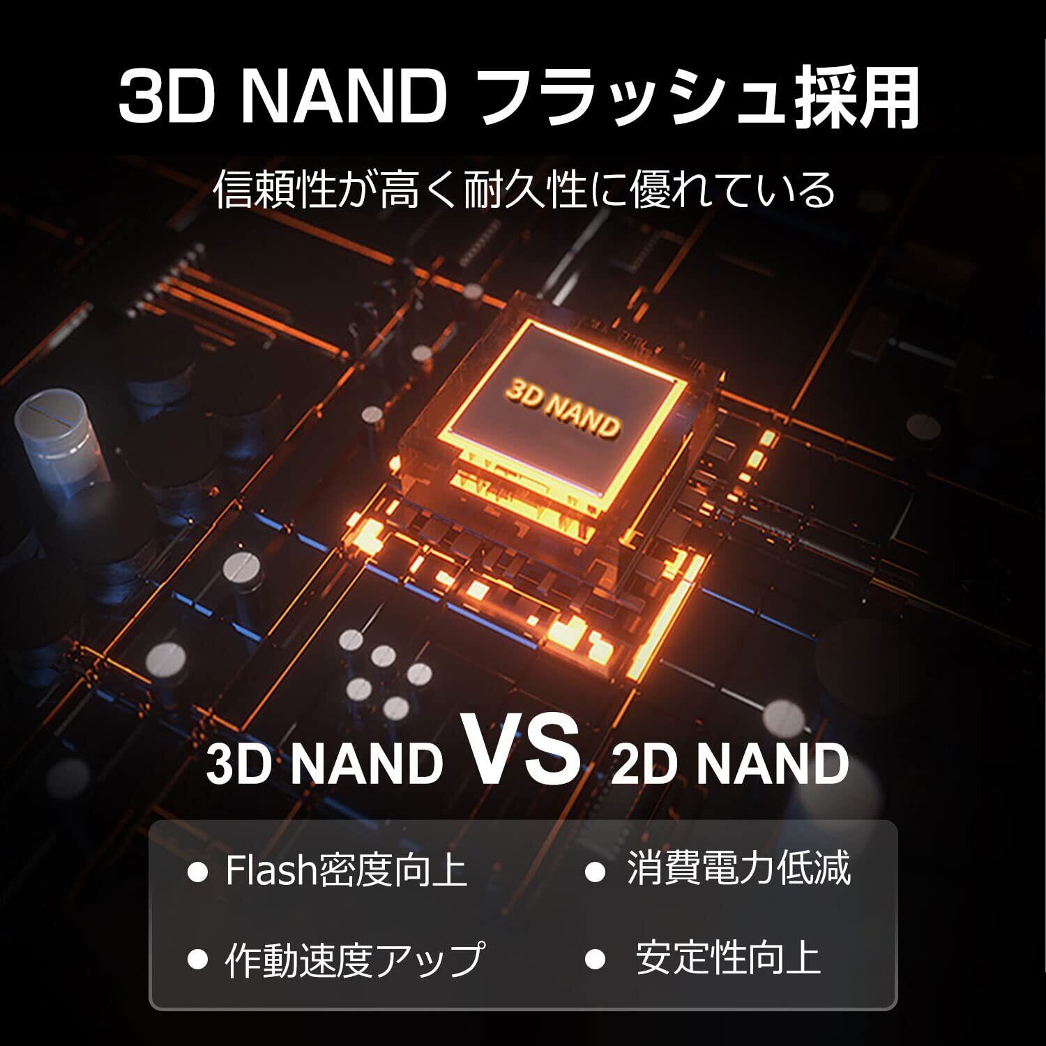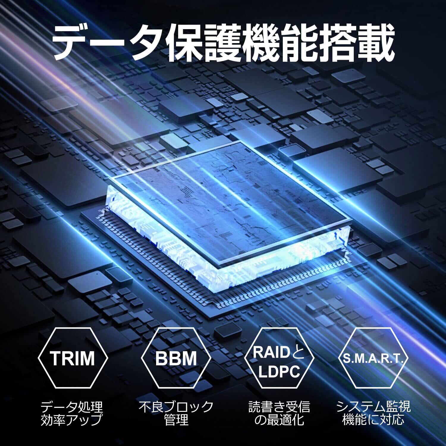 特徴:3D NANDフラッシュメモリの採用と、S.M.A.R.T.機能、不良ブロック管理(BBM)、RAIDとLDPC機能、TRIM機能の搭載で 性能と耐用寿命は大幅に向上しました。