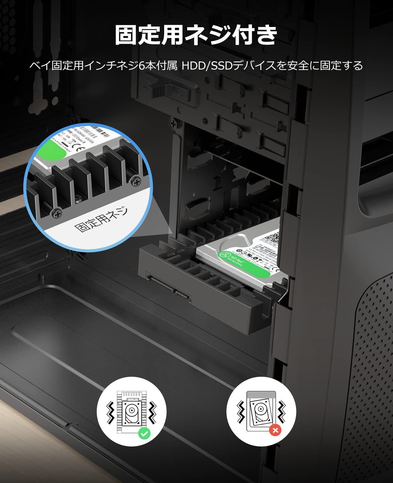 【安定性】6つの固定用ねじでパソコン本体にしっかりと取り付けて、ハードディスクを守ります。ハードディスクが揺れ動いたり、落下したりすることがなく、長期間安定した使用ができます。幅広いニーズに対応しています。