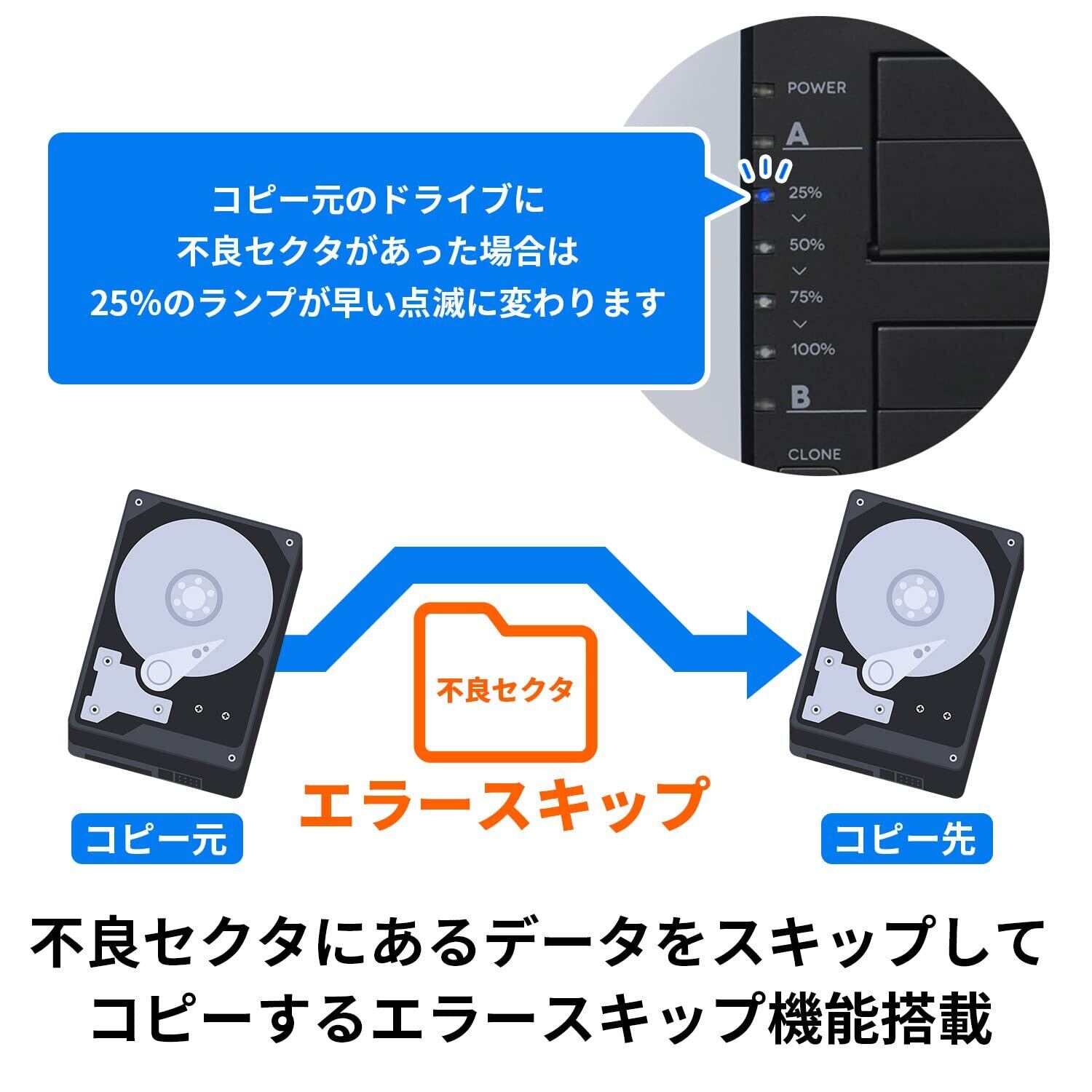 【エラースキップ機能搭載】データの読み込みも書き込みも不能になる不良セクタがあるドライブも、エラー箇所を強制的にスキップしてコピーすることができます。また、コピー元に不良セクタがある場合、LEDが高速点滅し、一目で確認できるようになっています。 ※修復機能はついておりません。 ※物理的エラーがある場合はコピーを行う事ができません。 ※不良セクタの状態によってはコピーが完了しない場合もあります。