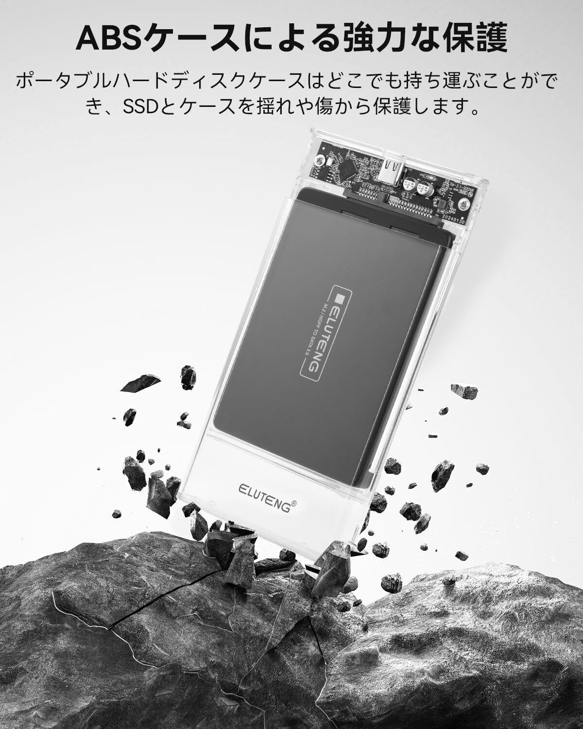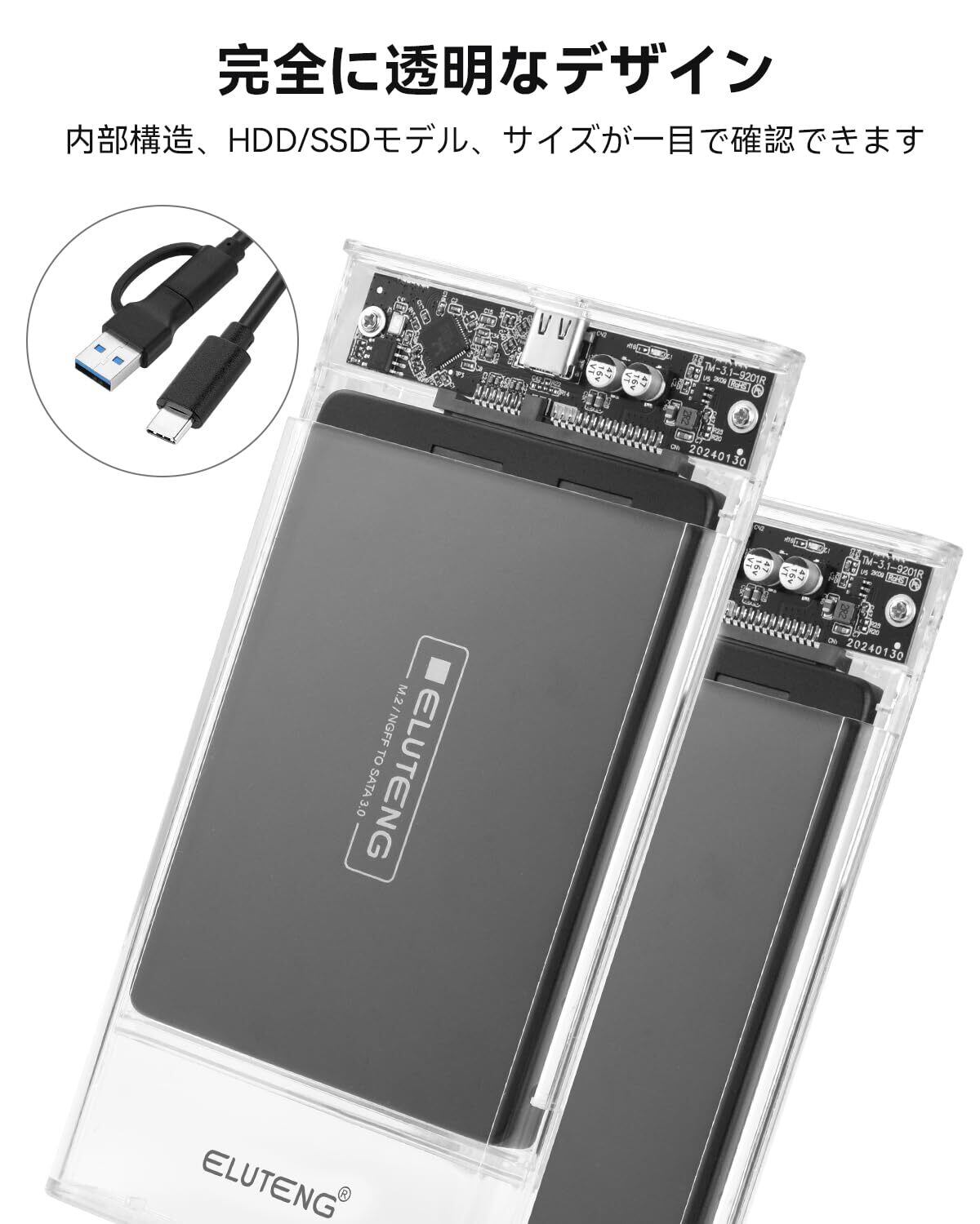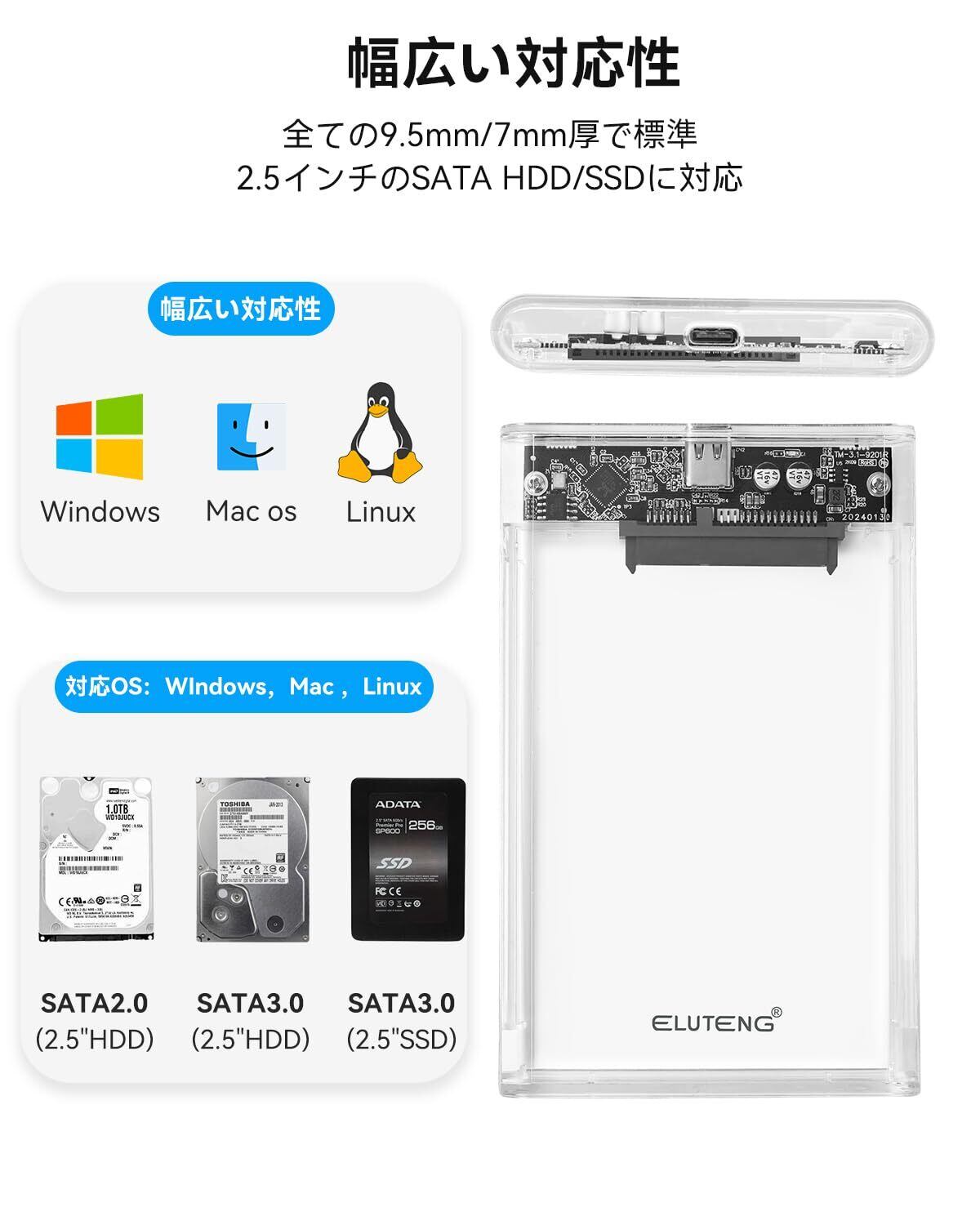 ELUTENG 2.5インチ HDD ケース USB3.1 GEN1 HDD/SSD ケース Type-C 6Gbps SATA III 外付けハードディスク 透明 ドライブケース 高速データ転送 UASP対応 SSD ドライブ ケース 120GB 128GB 240GB 256GB 500GB 512GB 1TB 2TB など対応(9.5mm以下)