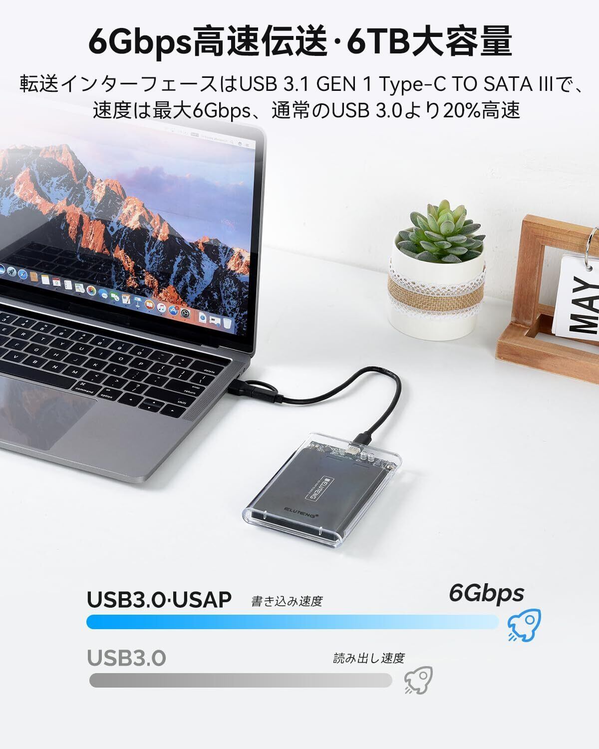 【USB3.1&UASP】送信インタフェースはUSB3.1 GEN 1 Type-C TO SATAⅢを採用しており、6Gbpsまでの速度を達すことができます。普通のUSB 3.0よりも20%速くなります。コンピューターのストレージ / バックアップ能力を大きく向上させます。注意:実際の送信速度は、さまざまな作業環境の影響を受けます。