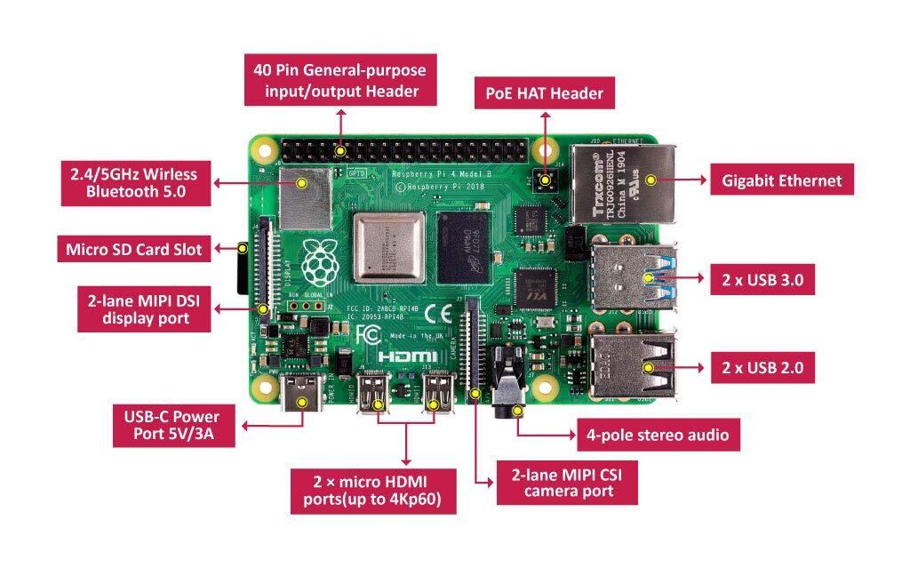 Raspberry Pi 4のビデオ&サウンド: 2×マイクロHDMIポート(最大4Kp60までサポート);2レーンMIPI DSIディスプレイポート;2レーンMIPI CSIカメラポート;4極ステレオオーディオ及びコンポジットビデオポート