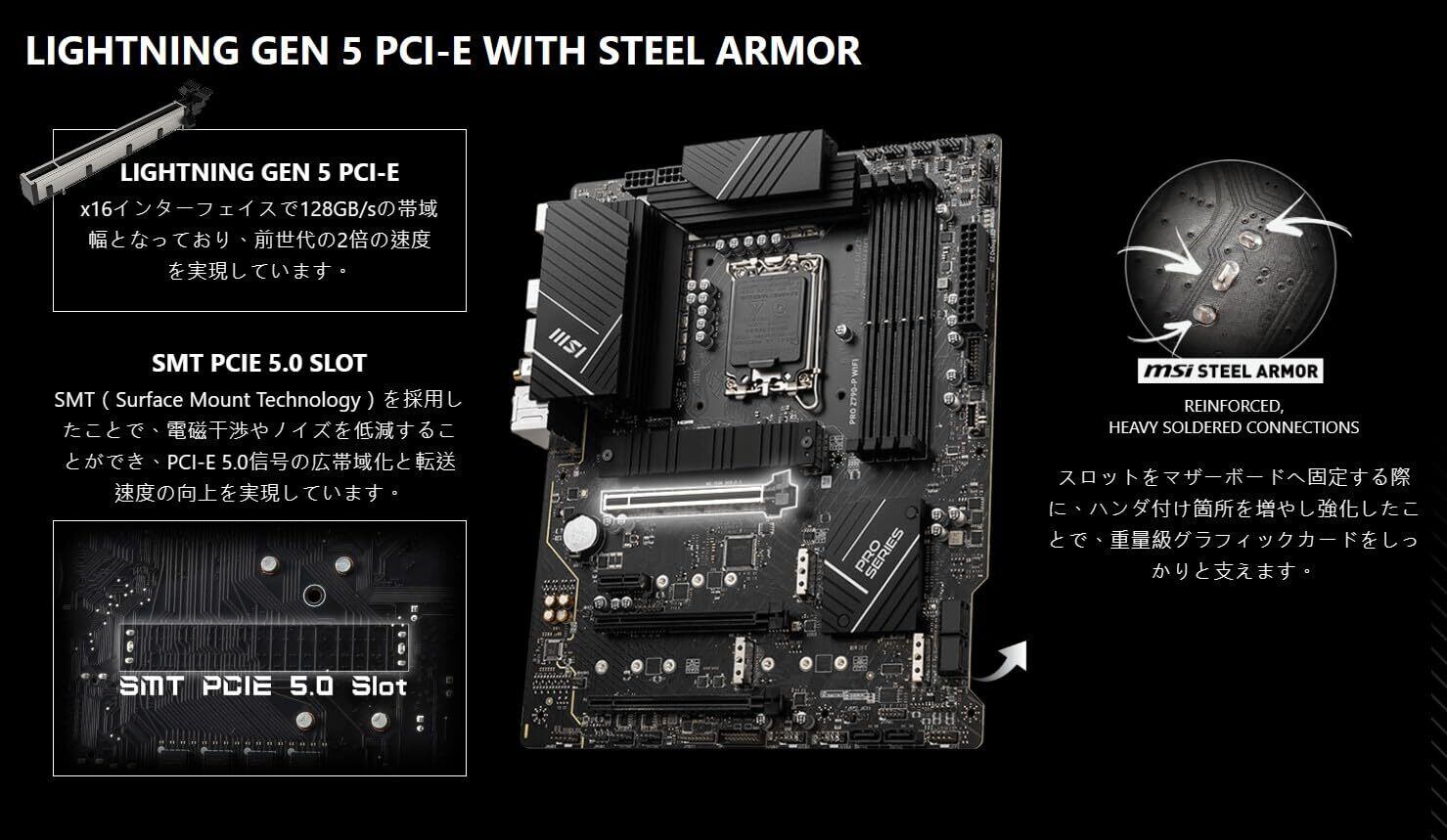 ●拡張スロット詳細:PCI_E1 PCIe 5.0 x16、PCI_E2 PCIe 3.0 x1、PCI_E3 PCIe 4.0 x4、PCI_E4 PCIe 3.0 x1
