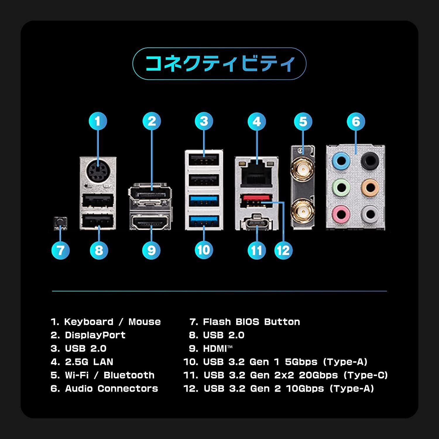 ●USB(リア):4x USB 2.0、2x USB 3.2 Gen1 Type A、1x USB 3.2 Gen2 Type A、1x USB 3.2 Gen2x2 Type C