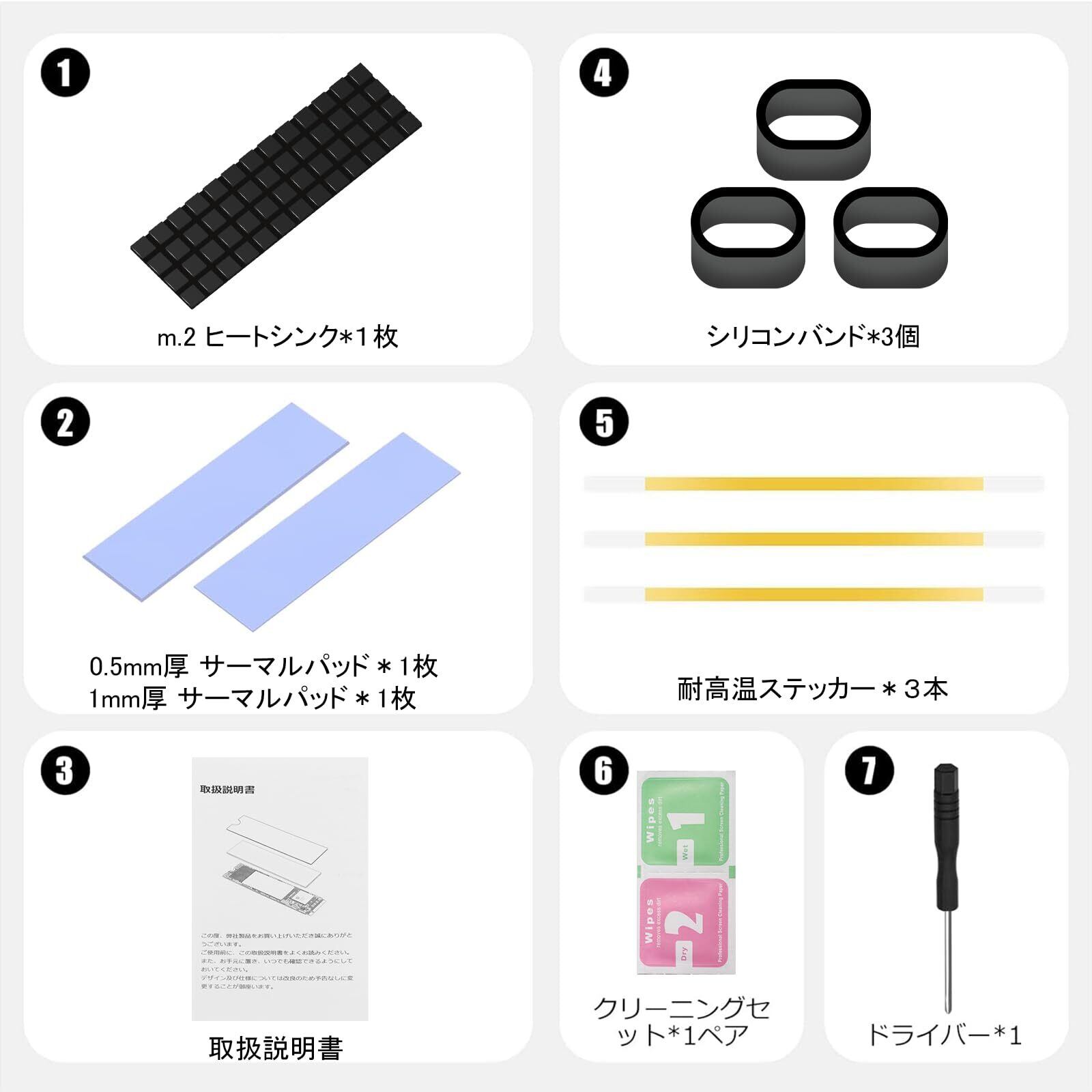 すべての部品が揃った:厚みの違いサーマルパッド0.5mm/1mm其々1枚、固定用にシリコンバンド、耐高温テープ二種類を、ドライバー、取り付け説明書などすべても揃いましまたため、一回買い、素人としてもスムーズに設置できます。