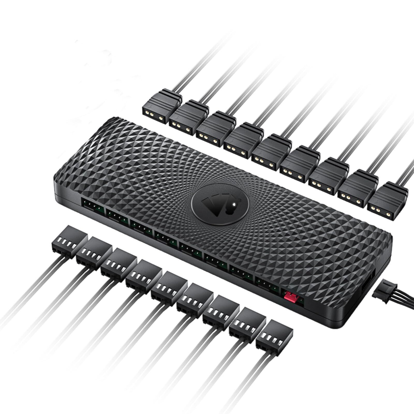 AsiaHorse 2IN1 ARGB PWMファンハブ、9 PWM 4ピン ポート & 9 ARGB 5V 3ピン ポート、5V ARGBマザーボード同期 PWM機能ファンアダプター SATA電源入力 PCケースファンおよびRGBアクセサリ用のARGB PWMハブ VE-HUB