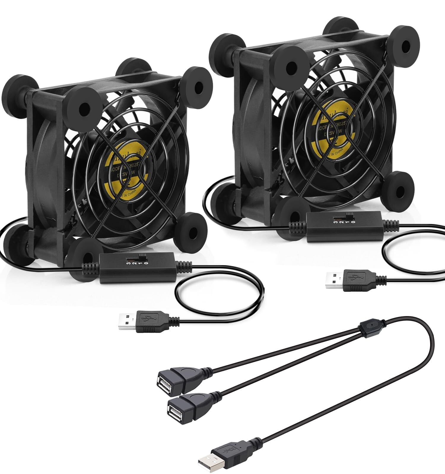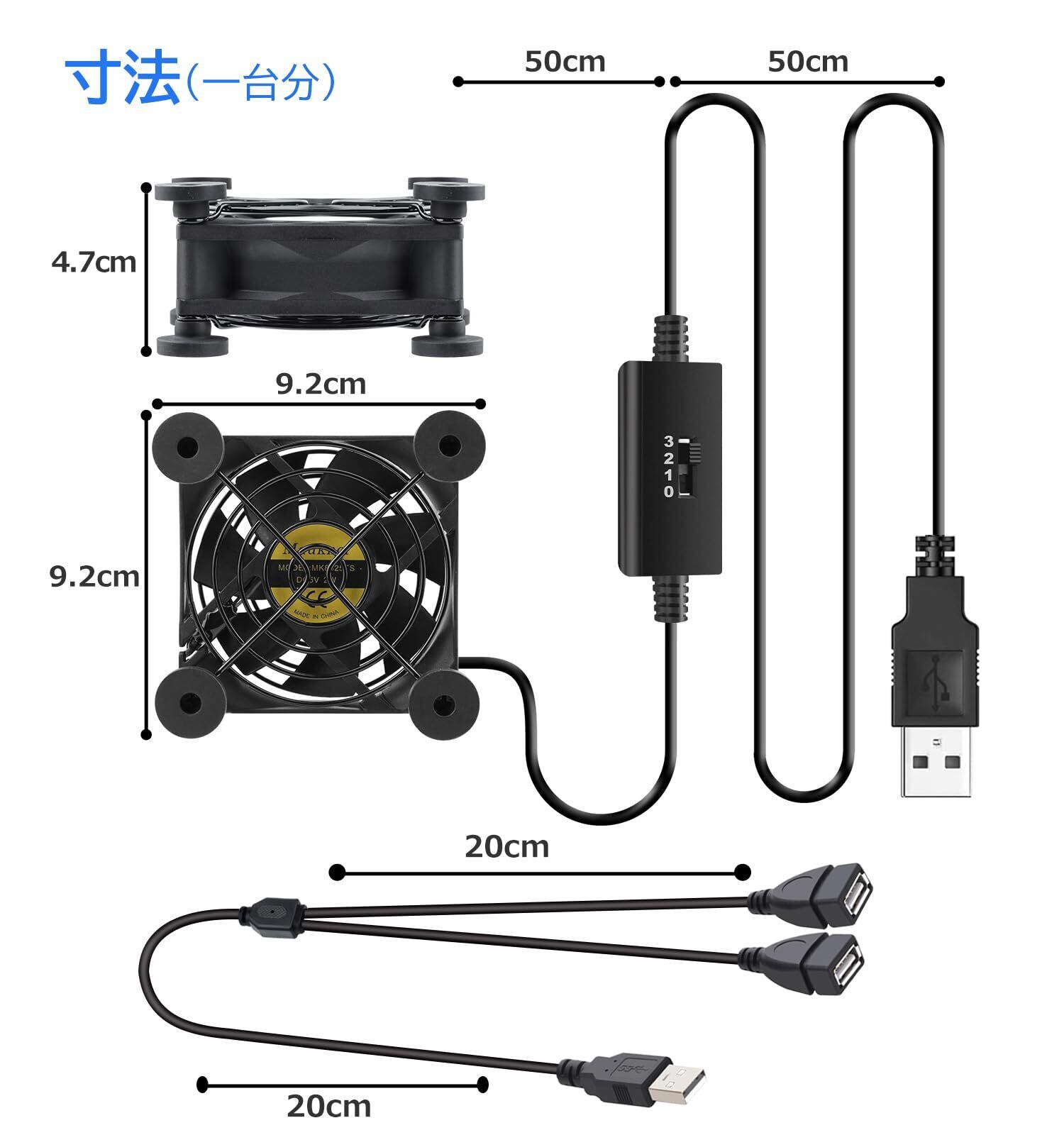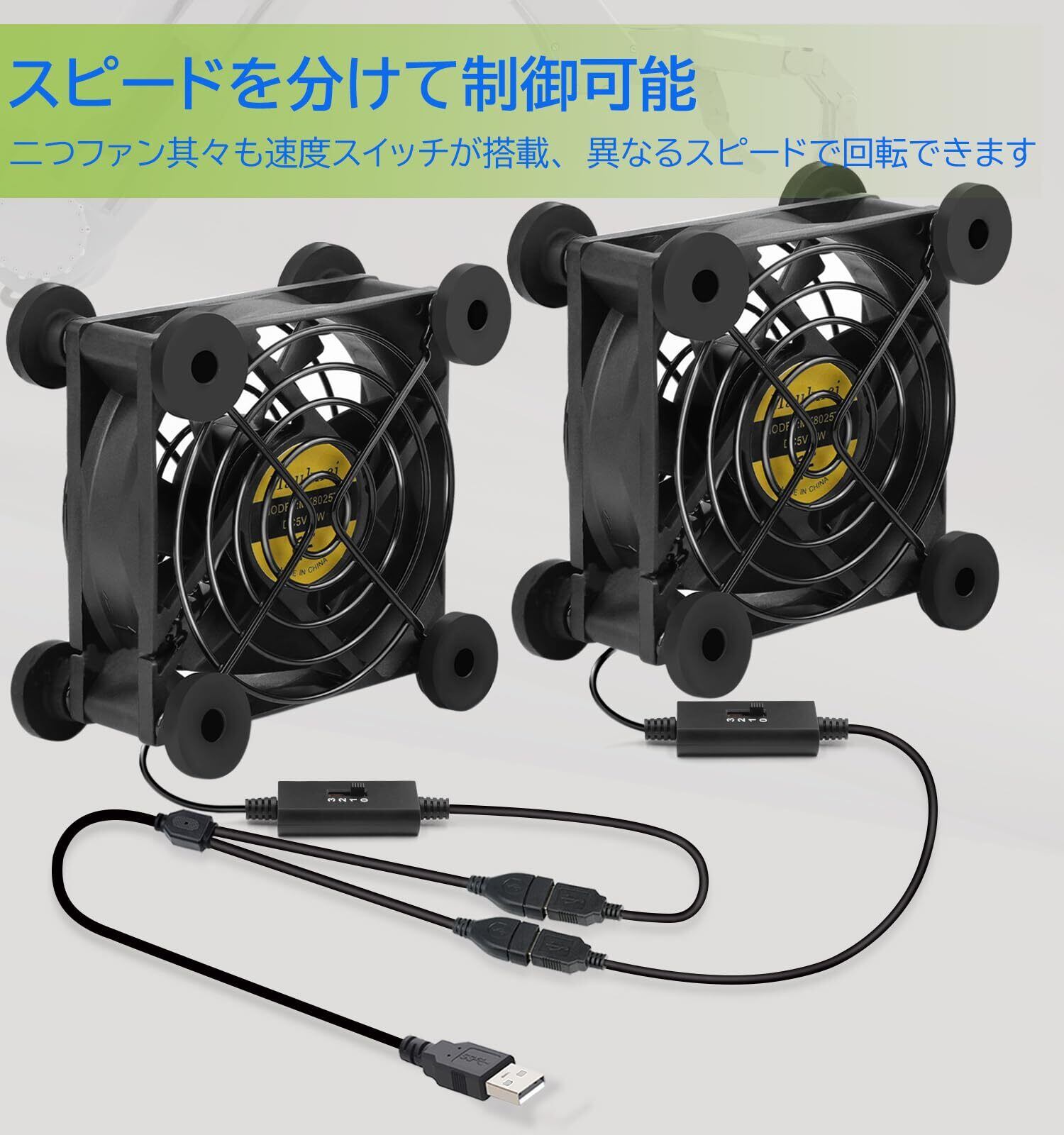 2台1組セット。二つUSB ファンには其々速度コントローラーが付いており、個別に使用することも、付属のUSB分配ケーブルで接続することもできます。これにより、二つファンを駆動するのにUSB プラグ1 つだけで可能で、2 つのファンは異なる速度を実現することもできます。