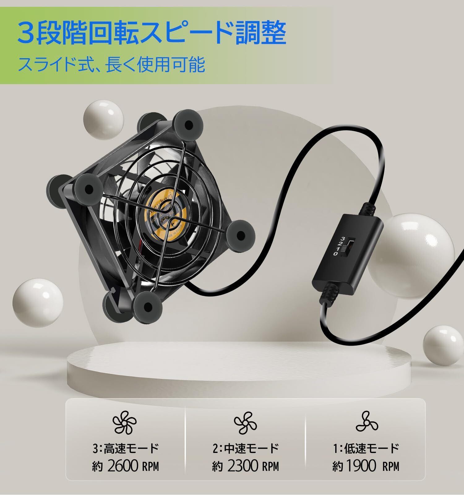 電源スイッチに速度コントローラーが搭載されており、風量は3段階調節可能でき、最大速度は 2600RPM (±5%) に達し、最小速度は 1900RPM (±5%) です。温度に応じて、適切な速度を選択し、静音性と放熱性の最適なバランスを実現します。