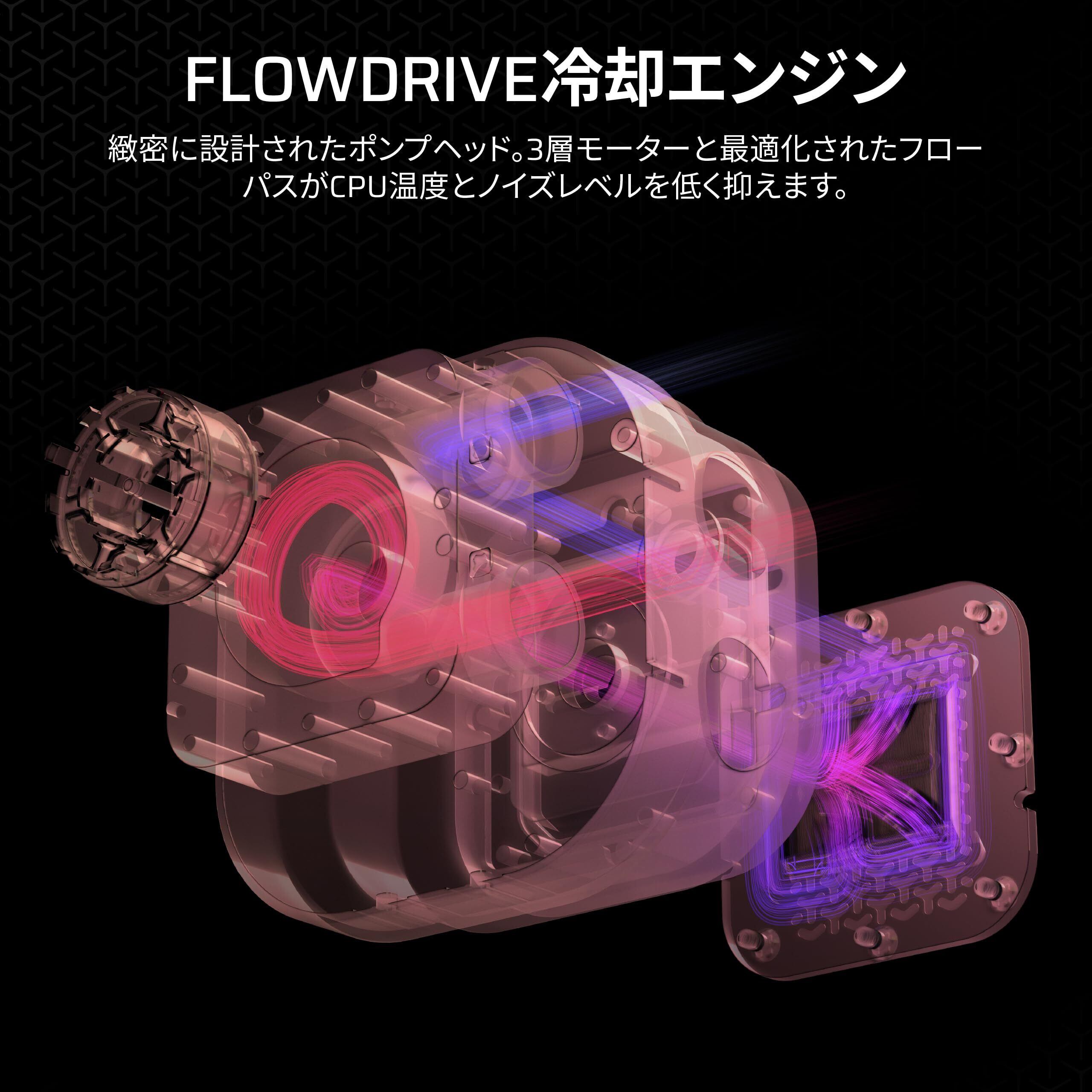 FlowDrive冷却エンジン:CPU内蔵のヒートスプレッダーと接地面を最大化するため設計された冷却プレートと、三相モーターを搭載した高性能ポンプでより効率な冷却性能を確保しています。