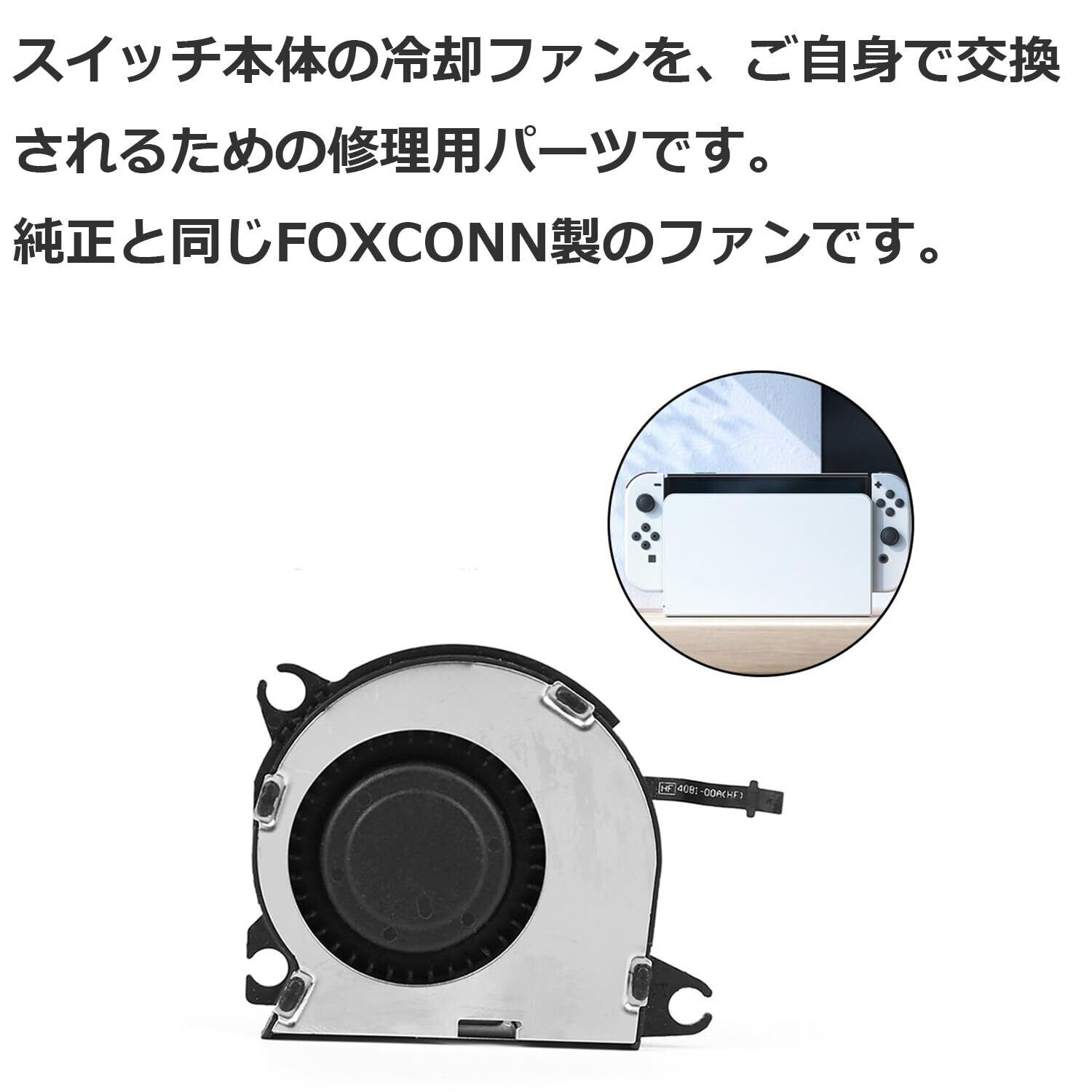 ご注意:説明書は付属しておりません。交換方法について図解付きの手順を記載したHPへのQRコードを付属しておりますのでご参照ください。または、YouTubeで「スイッチ ファン 交換」と検索すると動画が出てきますので、ご参照のうえ交換をお願いいたします。