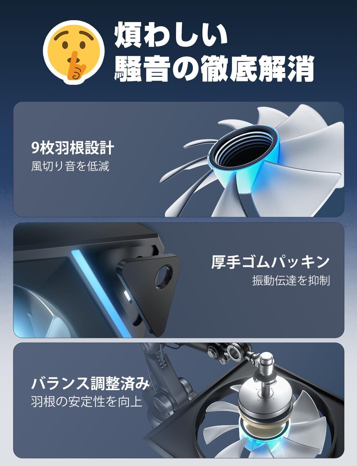 [独自のノイズ低減設計]:効率的な冷却を提供する一方で、当社のPCケースファン 120MMは最大ノイズレベルをわずか30 dB(A)に抑えます。アップグレードされた9枚のブレードデザインと高品質プラスチックの使用により、熱放散性能が向上するだけでなく、風の騒音と振動も著しく低減されます。ファン出荷前に行われるゴム製のノイズ低減パッドの追加およびバランス調整により、振動とノイズをさらに排除し、静かな運転環境を提供します。