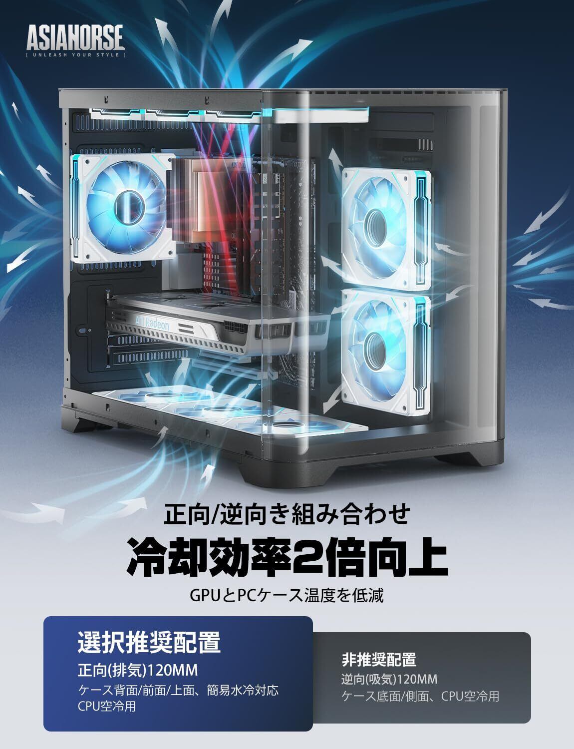 [仕様]: モデル:AMICI-5GT-White。数量:3本。サイズ:120*120*2.5。正向きファンブレード。回転数:650-1800 RPM/Min。ノイズ:6-30 dB(A)。風量:61.5 CFM 。風圧:2.0mmH2O。ベアリングのタイプ:ハイドロダイナミックベアリング。寿命:50000時間以上。240/360mmのCPU水冷高さに対応。