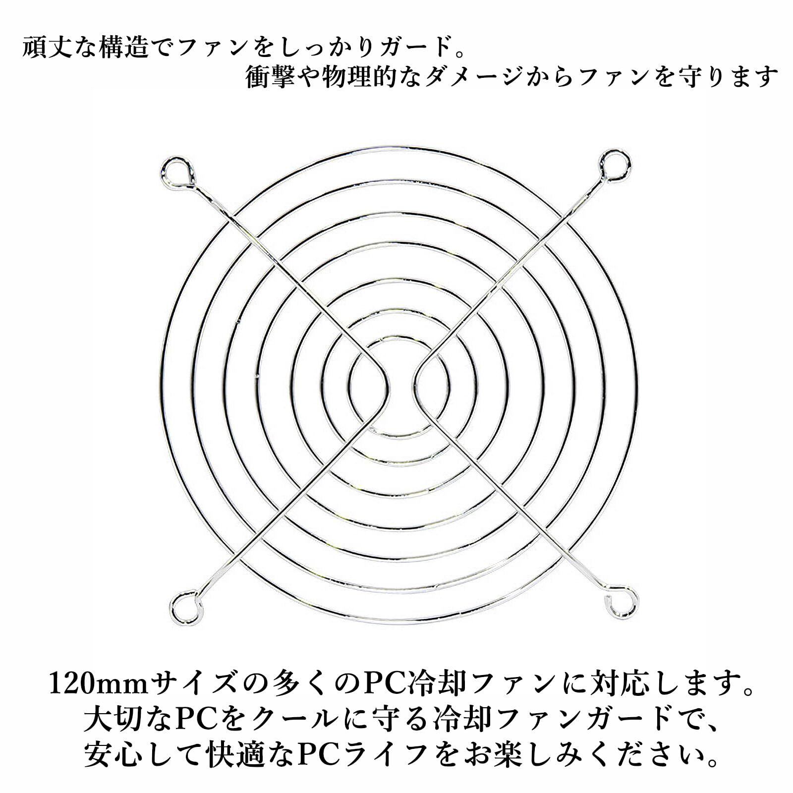 120mmサイズの多くのPC冷却ファンに対応します。大切なPCをクールに守る冷却ファンガードで、安心して快適なPCライフをお楽しみください。