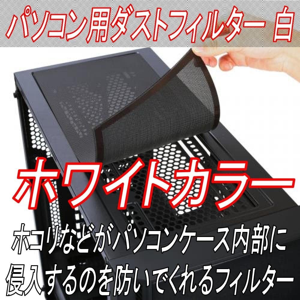 【パソコン用ダストフィルター白】PCケースのスリットパネル部分に取り付けることで、ほこりなどがパソコンケース内部に侵入してくるのを防いでくれる、ほこり対策のダストフィルター・防塵フィルターです。メッシュフィルターを取り付けておけば、ケース内部の掃除の手間を減らし、ファンやパソコンの寿命を延ばすことも可能な埃フィルターです。